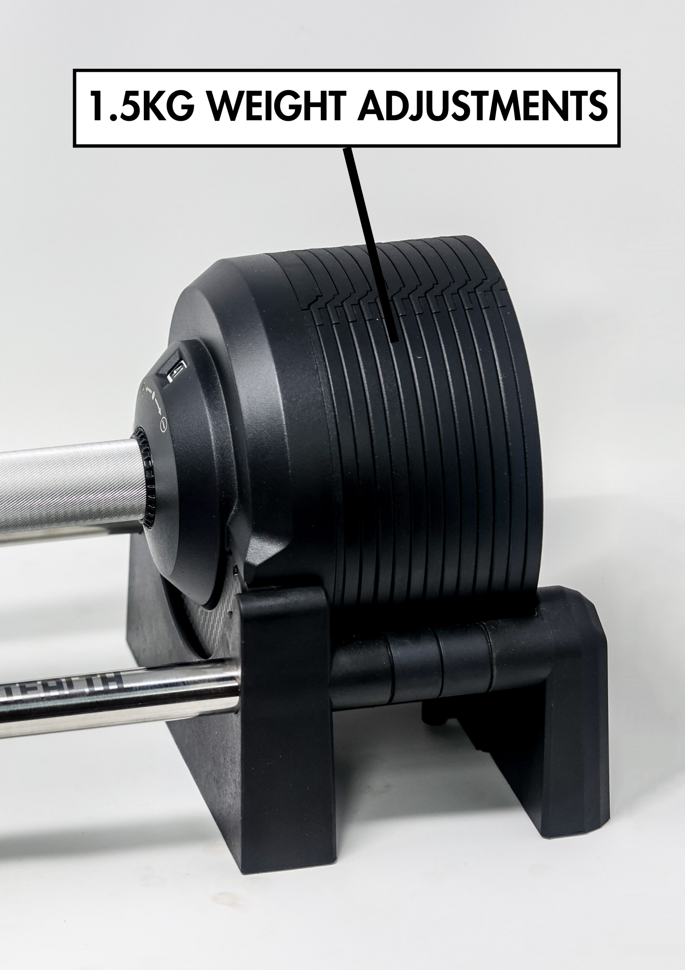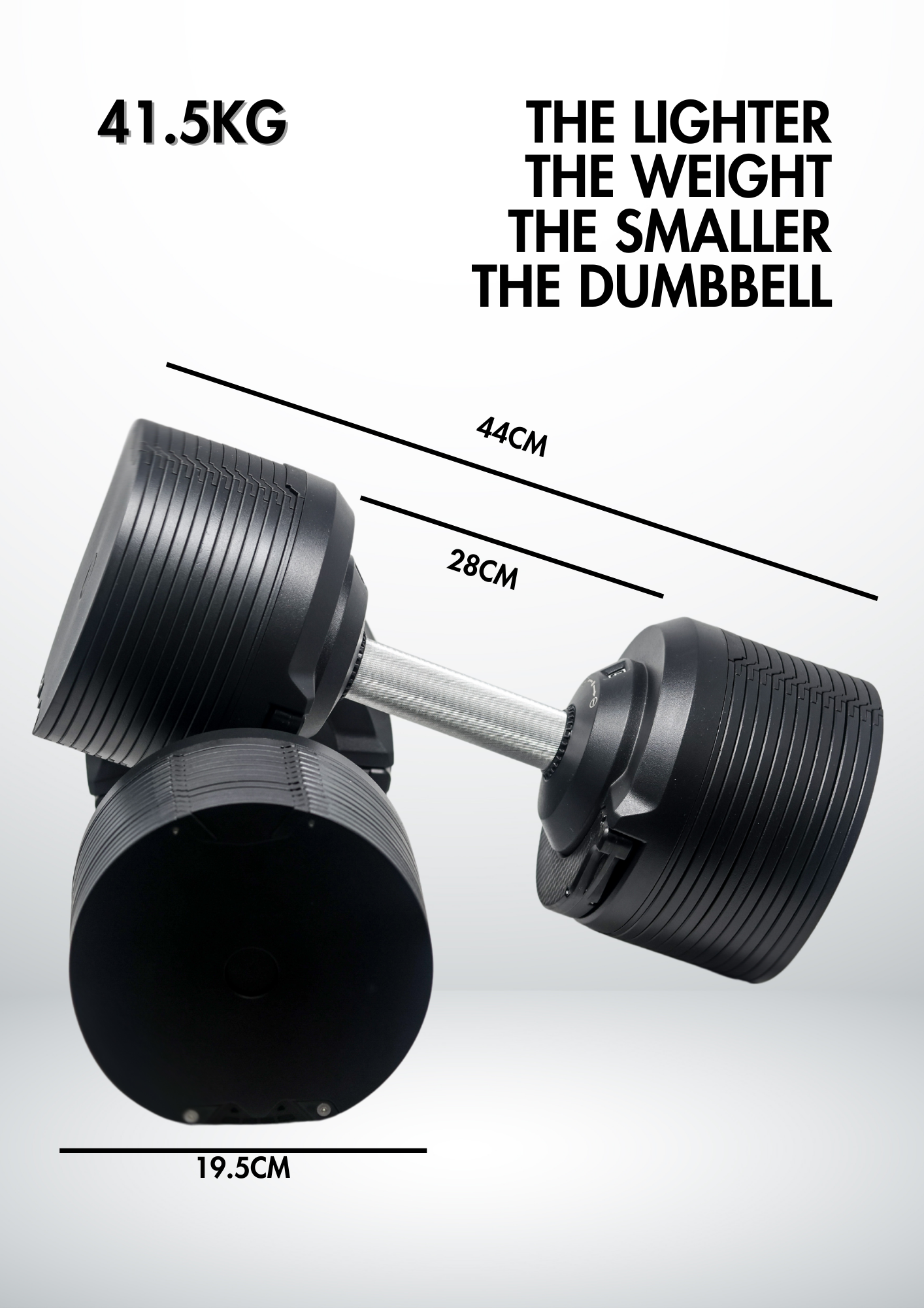 Weight adjustment range per dumbbell, 41.5kg: 4kg, 5.5kg, 7kg, 8.5kg, 10kg, 11.5kg, 13kg, 14.5kg, 16kg, 17.5kg, 19kg, 20.5kg, 22kg, 23.5kg, 25kg, 26.5kg, 28kg, 29.5kg, 31kg, 32.5kg, 34kg, 35.5kg, 37kg, 38.5kg, 40kg, 41.5kg