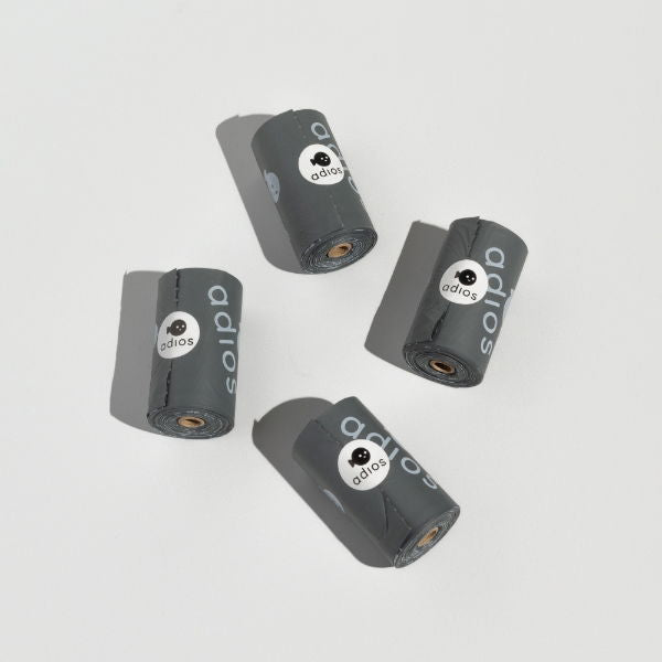 Adios dog poo bags are plant-based, compostable and extra thick. Certified HOME compostable Made from natural materials Extra thick & easy to open No microplastics 15 bags to a roll Grey colour