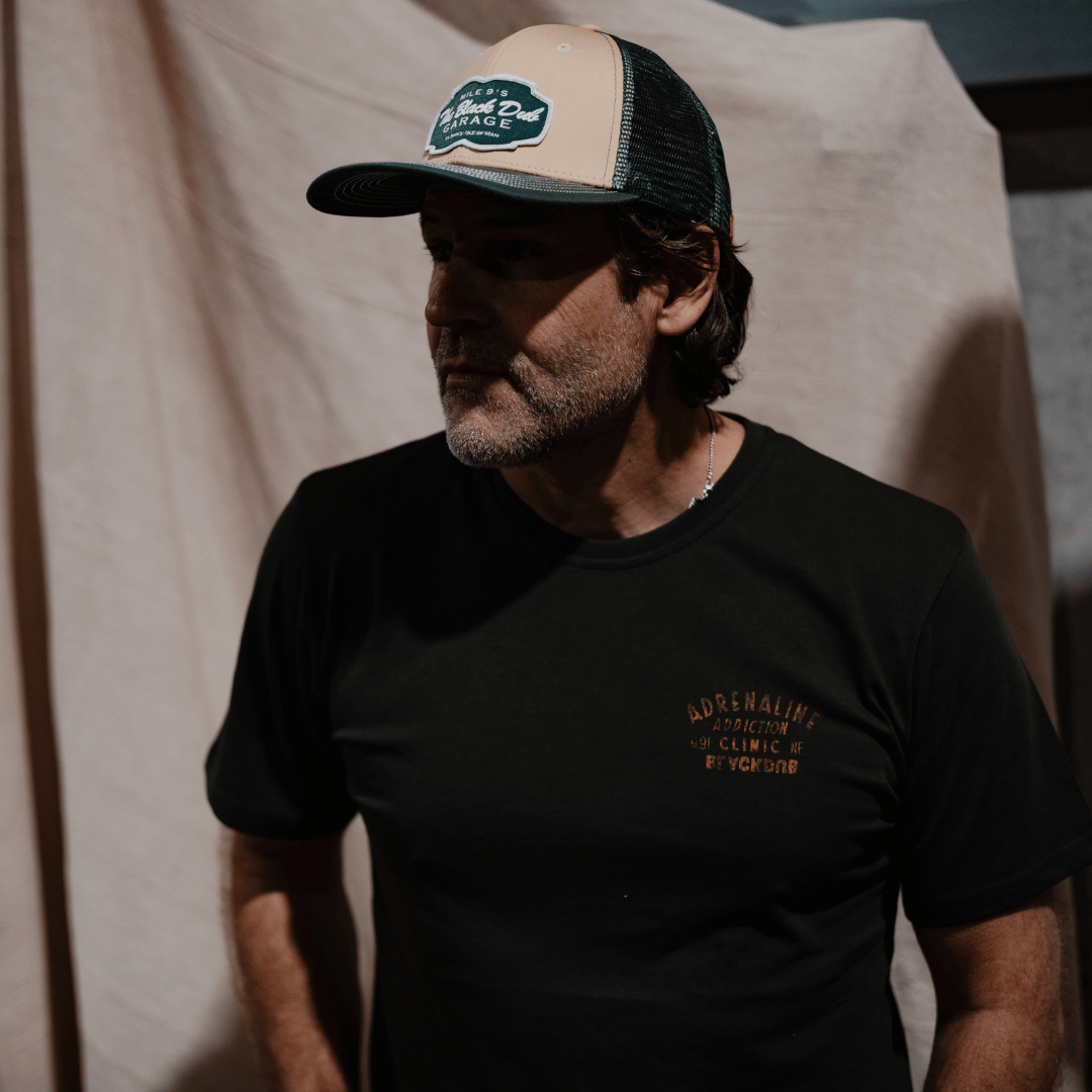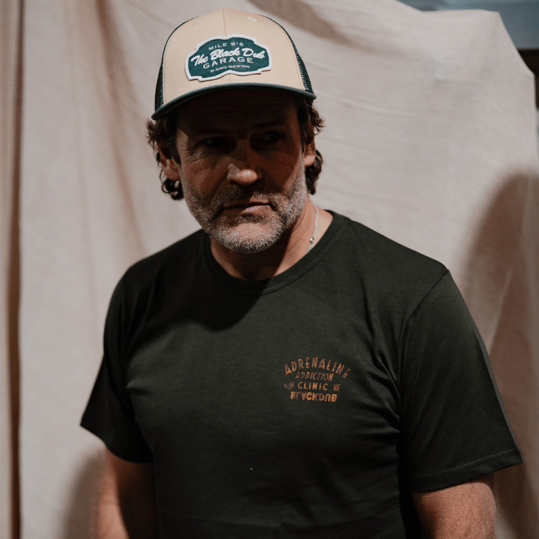 Featuring a bold and eye-catching logo on the front and back, our Green Tee proudly displays the words “Adrenaline Addiction” in striking lettering. This logo represents the thrill and excitement that we as spectators get at The Black Dub, mile 9 but also the Riders as they race through the off camber, bumpy Black Dub!