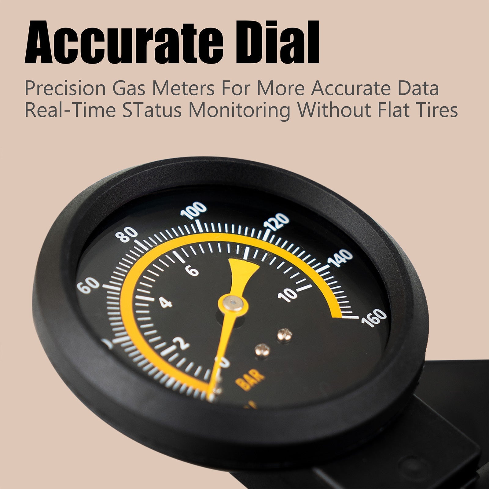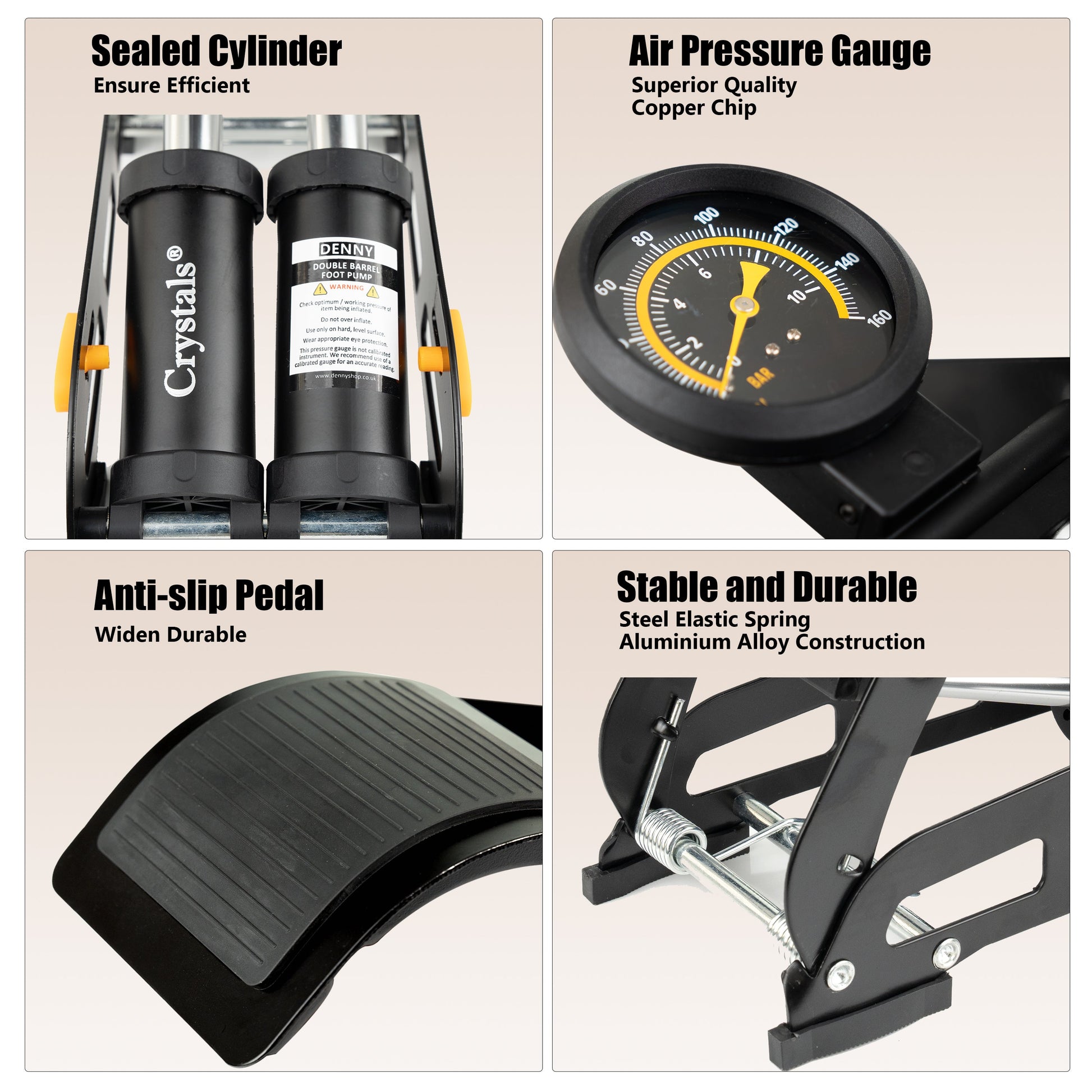 This foot pump is a superior quality air pressure gauge, easy to monitor air pressure with an accurate gauge up to 160 PSI (2 reading units: PSI/BAR). Multi-pipe valve, suitable for Schrader and Presta / Dunlop valves; Comes with 3 inflation nozzle valves, and suitable for different types of bicycles, car tyres, motorcycles, air cushions, sports balls and other inflatable toys.