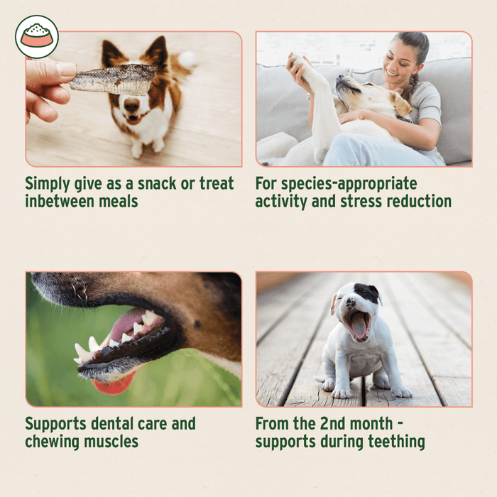 • The slightly chewy consistency has a positive effect on dental health, promotes chewing muscles and can reduce tartar