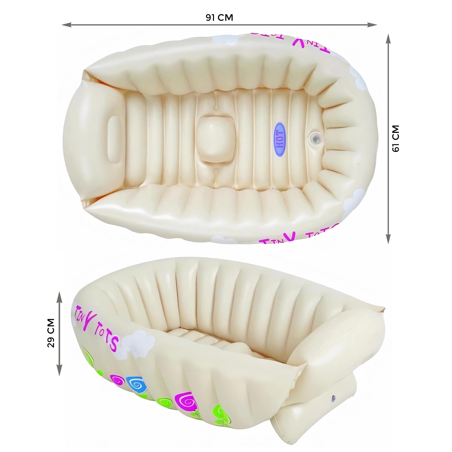 Let your baby splash away in the safety of an inflatable baby bath! Your baby deserves the best and the Heat Sensor Inflatable Baby Bath is ideal for the perfect temperature and is easy to store/carry. It has a special raised support on the bottom to avoid sliding into the water. The words 'HOT WATER' appear on the bottom when the water is too hot. Includes a plastic pothook for easy drying after use.