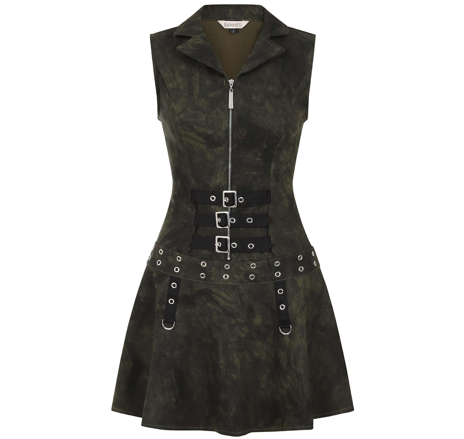 With its army green colour and unique style, this sleeveless dress oozes edginess and comfort. It's made from a stretchy fabric, ensuring a flexible and flattering fit. A structured collar and a central zipper give off a strong, utilitarian feel, while three decorative buckle straps cinch the waist for a striking silhouette. Adding to its punk-inspired charm are grommet and ring details along the waistband and hem. The skirt is adorned with black strap accents and metal rings, adding even more rebellious flair. The fitted bodice seamlessly flows into a flared A-line skirt, creating a perfect balance of style and wearability. This dress effortlessly combines military-inspired elements with a modern, rebellious attitude, perfect for those who embrace bold and confident fashion choices.