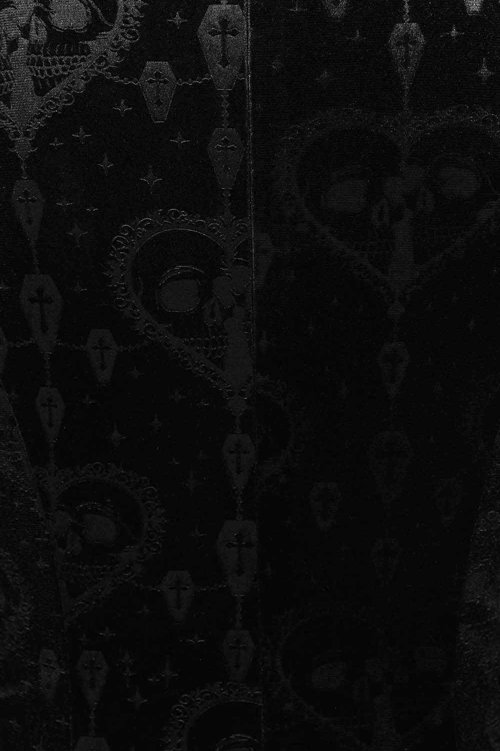 The all-over textured print features skulls within heart-shaped frames, coffins, crescent moons, and stars – a haunting pattern that adds layered depth to the lush velvet fabric. Made from a stretchy 95% Polyester, 5% Elastane knit, it hugs your figure while keeping you comfortable from dusk till dawn.