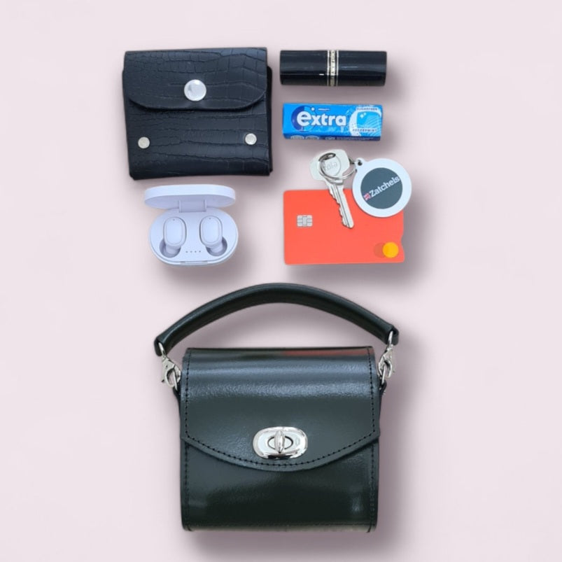 Example contents of a small purse, keys, lipstick & coins are shown in the Ivy Green Bauble Bag.