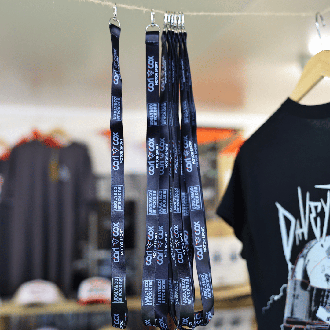 The Carl Cox Motorsport lanyard is the official VIP pass holder at The Black Dub, designed for premium viewing access. It features a sleek black and silver design, showcasing the Black Dub x Uggly&Co logo alongside the iconic Carl Cox Motorsport logo.