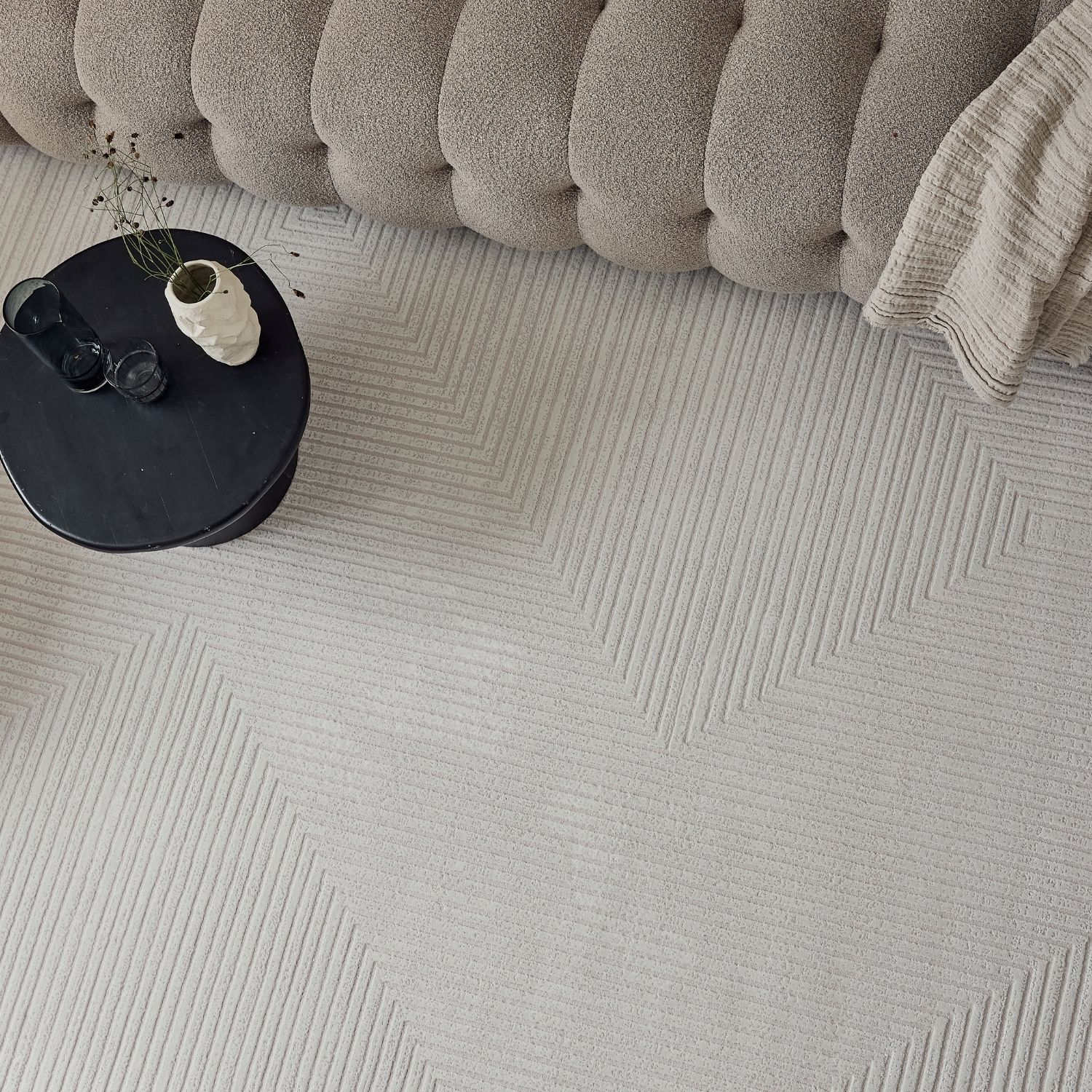 Bring contemporary charm to your home with the Carmel Cream Geometric Rug. Its subtle geometric design in neutral cream tones adds texture and interest without overwhelming your space, making it a perfect fit for living rooms, bedrooms, or hallways.