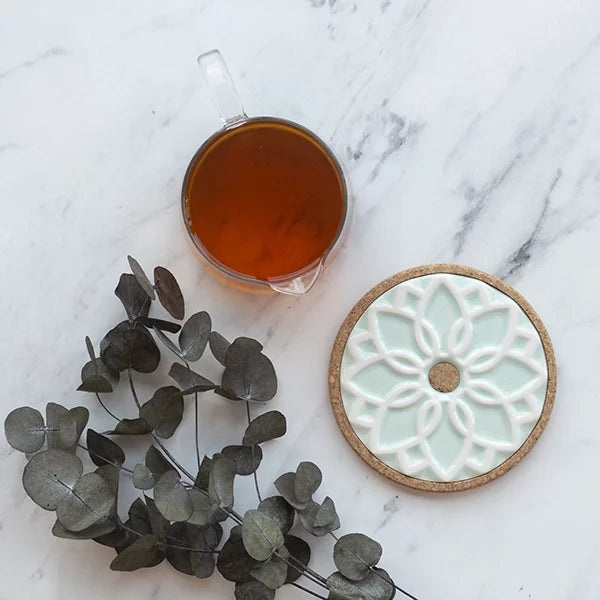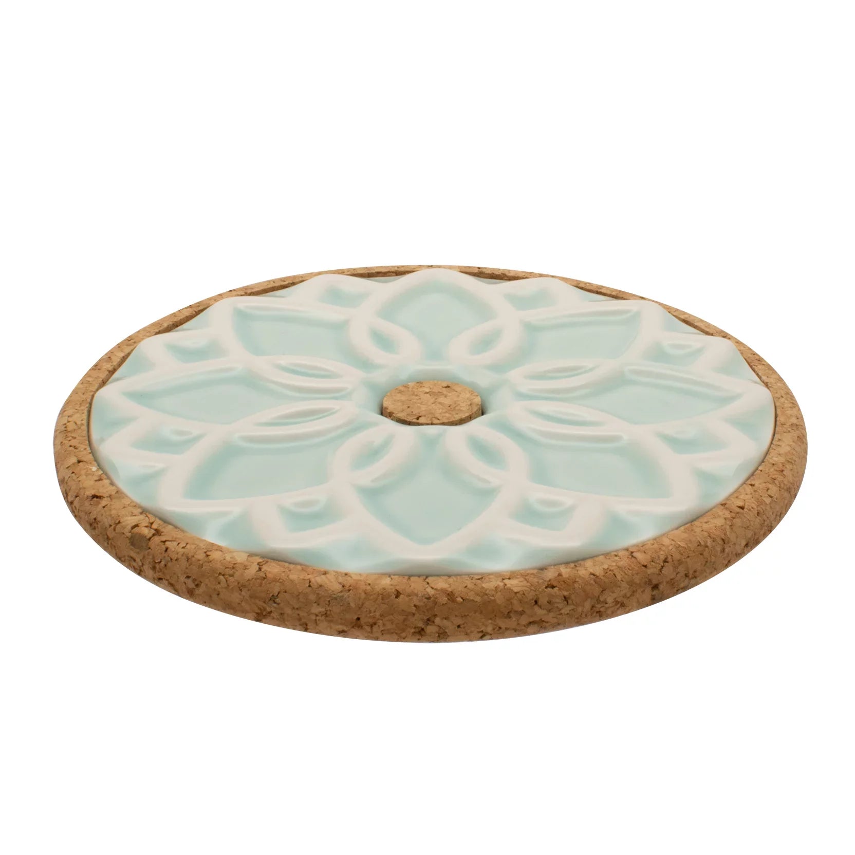 This ceramic hot pot stand Elvira in mint boasts a relief pattern and cork base, drawing inspiration from traditional Portuguese tiles. With a history of cultural exchange and artistic expression spanning five centuries, Portugal's iconic tiles hold a unique status as both decorative and architectural pieces.