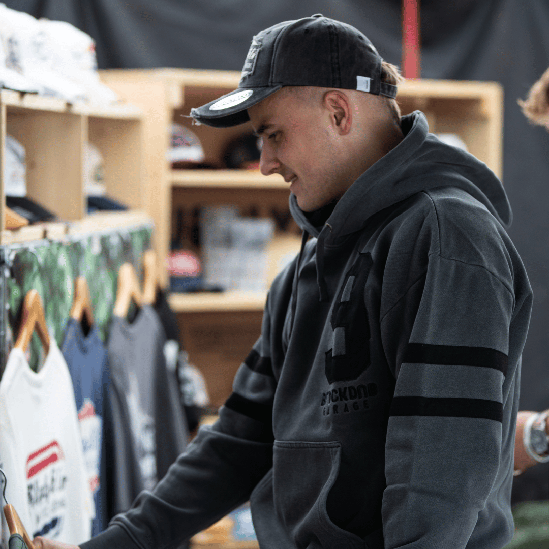 Introducing the collaborative masterpiece from Uggly&Co and The Black Dub, Mile 9: The Baseball-Inspired Hoodie. At its forefront, a weathered fabric baseball-style number 9 is skillfully sewn on, adorned with tassels and distressed edges, proudly showcasing the embroidered "Black Dub Garage" beneath.