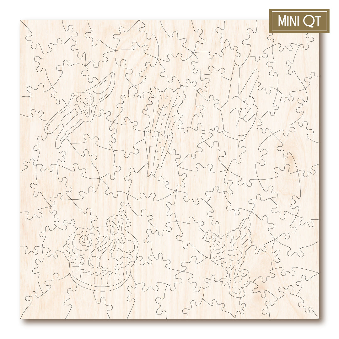 Our MINI QT puzzles are laser cut from thick, 4mm plywood and include 5 whimsies - they make a great puzzle snack!