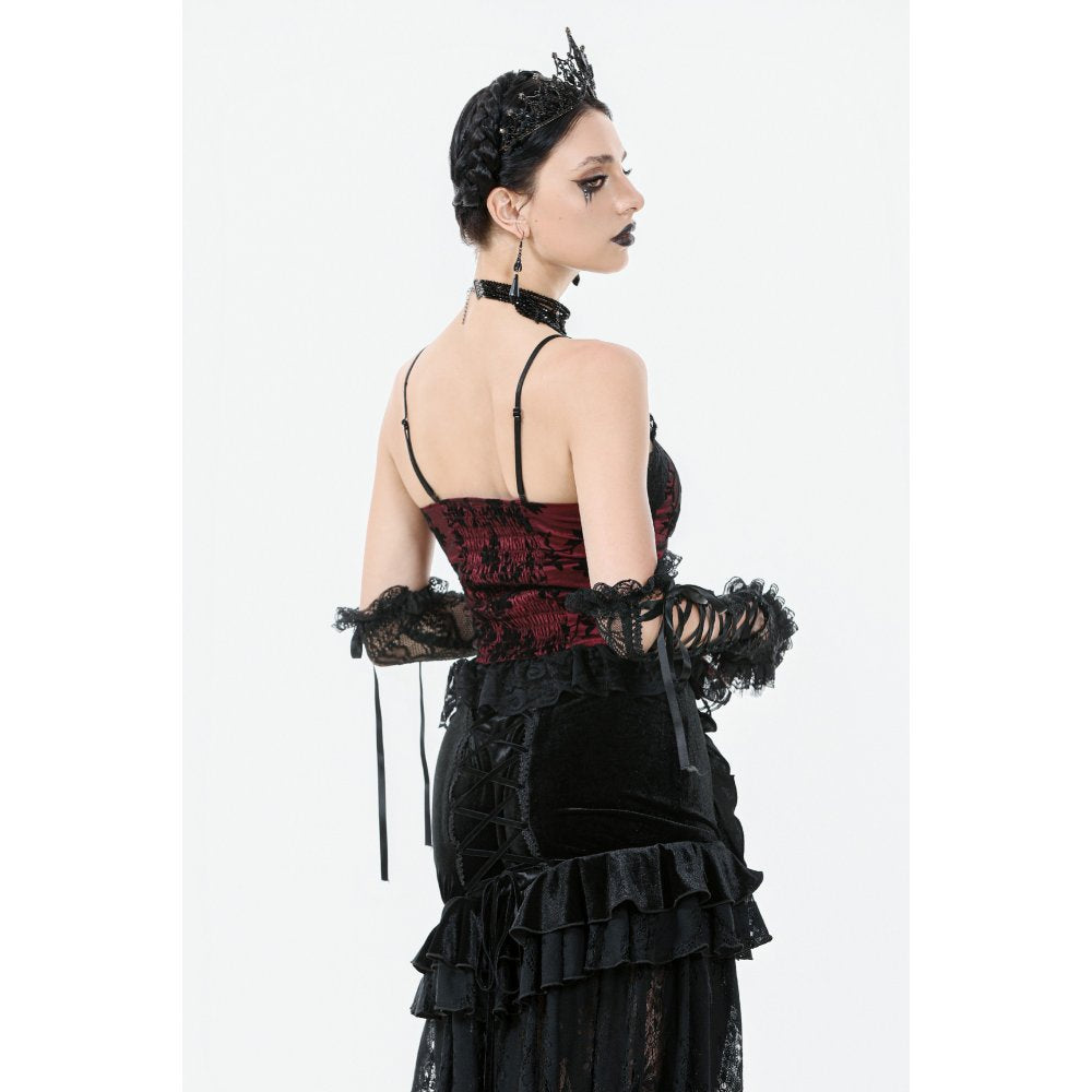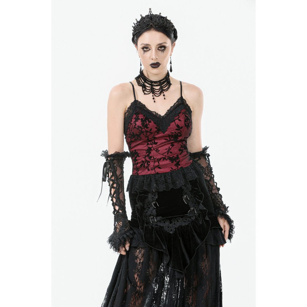 Channel timeless romantic goth elegance with the Dark in Love Althea Lace-Trimmed Velvet Goth Camisole – Burgundy. This luxurious camisole features rich burgundy velvet, delicate black flocked floral overlay, and sheer lace trim throughout. The structured fit and flattering V-neckline are framed by fine black lace, while the ruffled hem and adjustable shoulder straps add a whimsical touch. Perfect for layering with flowing skirts, lace gloves, or dramatic corsets, this statement piece is a must-have for any dark romantic wardrobe.