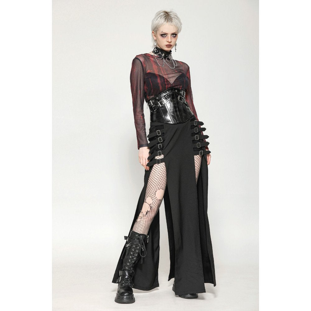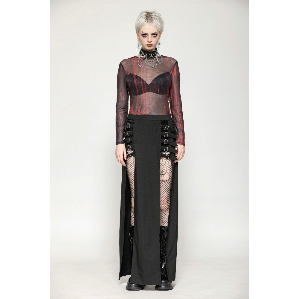 Explore your edgy side with the Dark in Love Carson Black and Red Tie-Dye Mesh Versatile Basic Top. This gothic-style top features a fitted silhouette and a round neckline, perfect for layering in alternative fashion looks. The sheer mesh fabric with a bold red and black pattern adds a touch of mystery to your wardrobe.