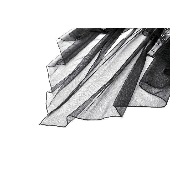 Falling from the waist are cascading layers of sheer black and white mesh, cut in jagged asymmetrical points for maximum movement and visual impact. Perfect for pairing with leggings, mini skirts, or worn alone for an avant-garde gothic statement look.