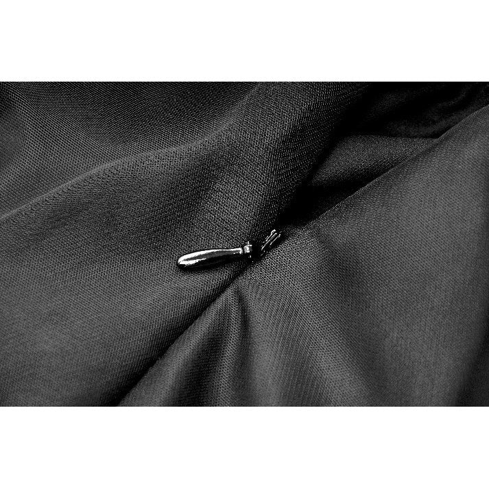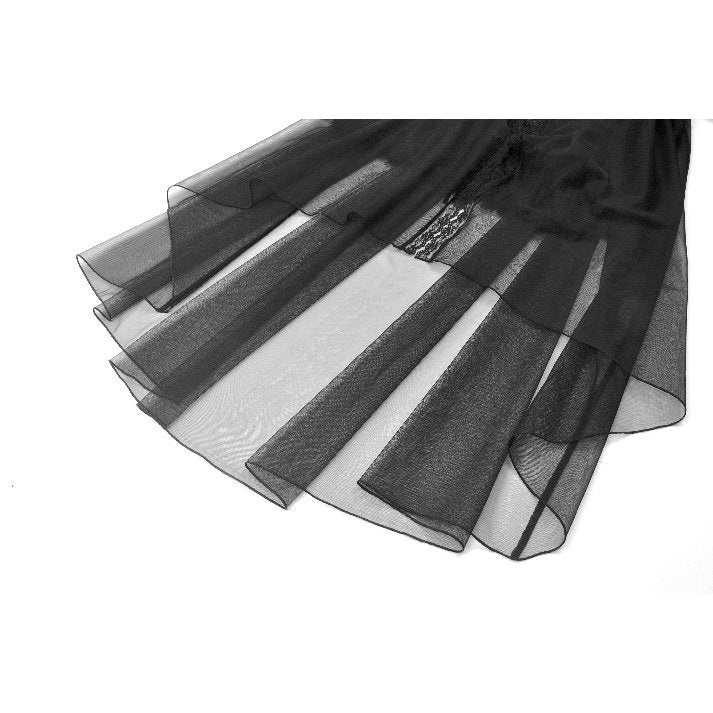 The skirt cascades in layers of flowing mesh with an elegant high-low hemline, revealing intricate lace edging beneath. Perfect for gothic tea parties, alternative weddings, or moonlit soirées, this piece combines drama with sophistication.