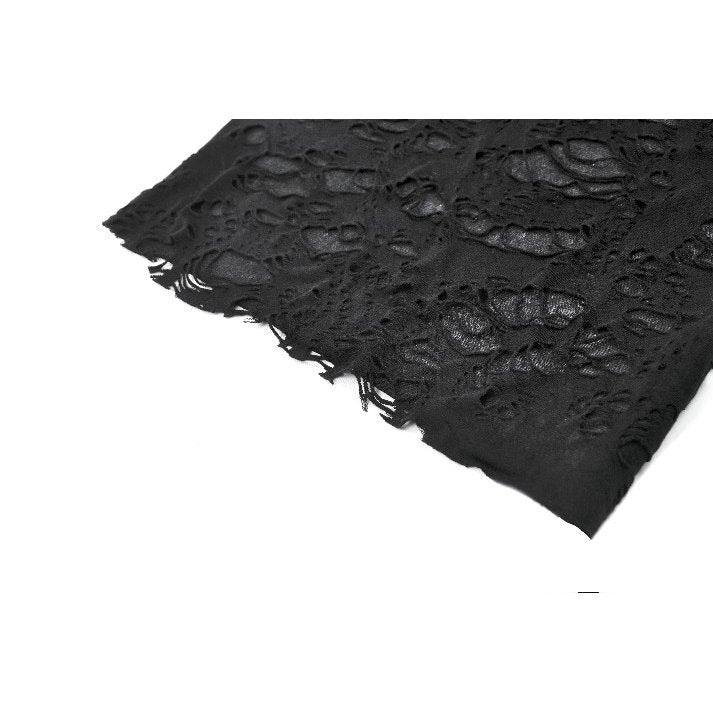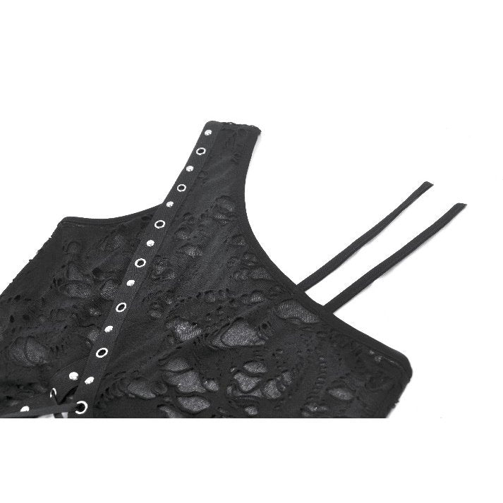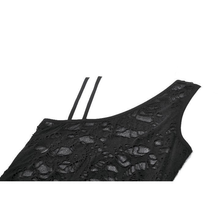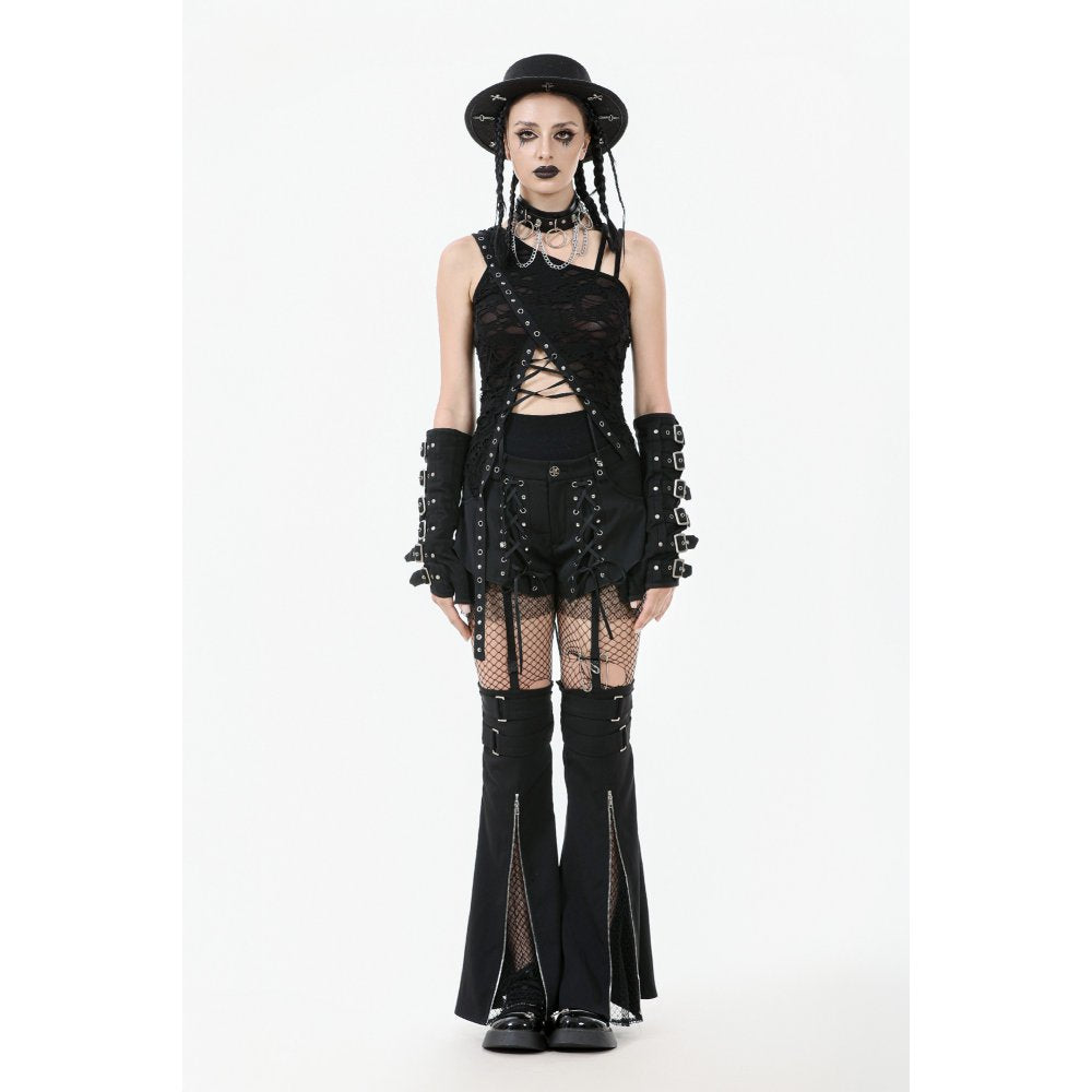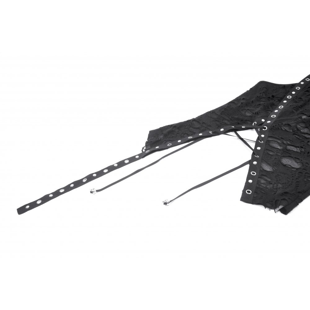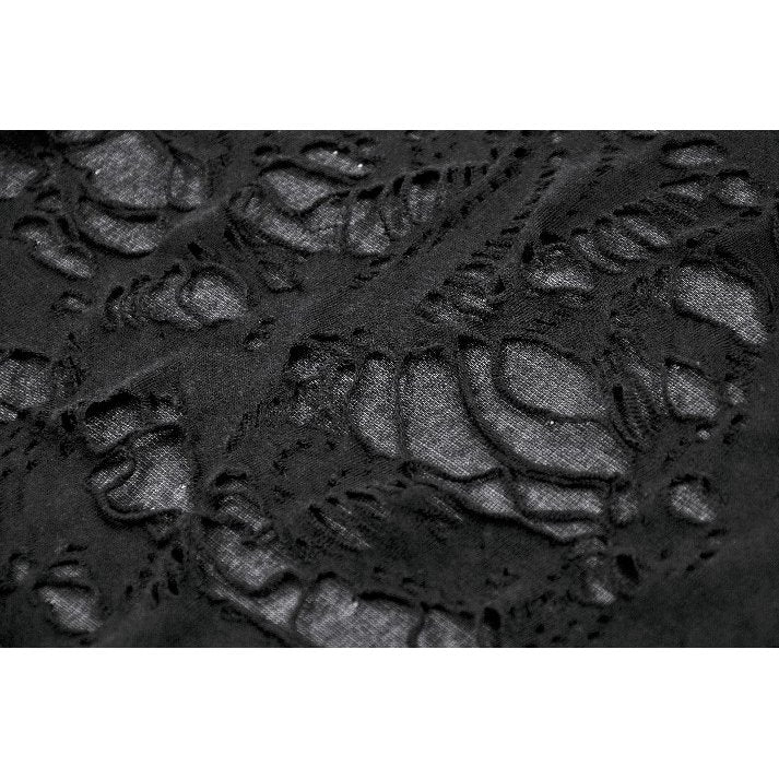 Step into a world of dark rebellion and edgy elegance with the Dark in Love Morrigan One-Shoulder Lace Goth Top – Black. This striking asymmetrical design blends romantic lace with industrial punk elements, creating a bold statement piece for your alternative wardrobe. The floral burnout fabric creates dramatic texture while silver eyelets and adjustable lace-up detailing across the front add a customisable fit. Finished with an uneven hem and delicate straps, it’s the perfect top for layering or wearing solo to your next underground soirée or goth festival.