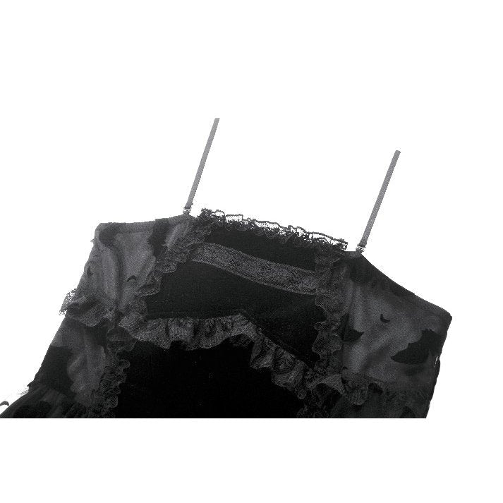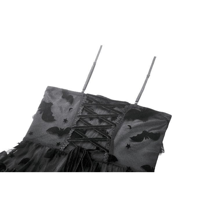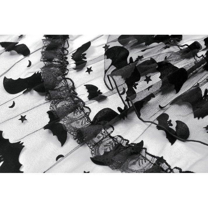 Unleash your nocturnal elegance with the Dark in Love Morwenna Bat Mesh Layered Goth Mini Dress. This captivating piece features a delicate bat-pattern mesh layered skirt with cascading ruffles, creating a playful yet mysterious silhouette. The fitted bodice is adorned with intricate lace trim, framed with a cut-out panel at the bust for a dramatic edge.