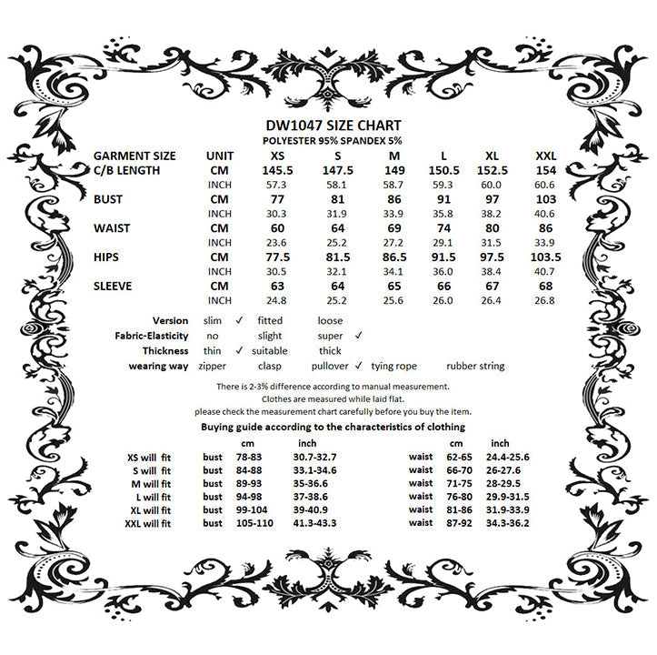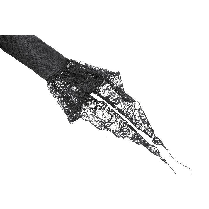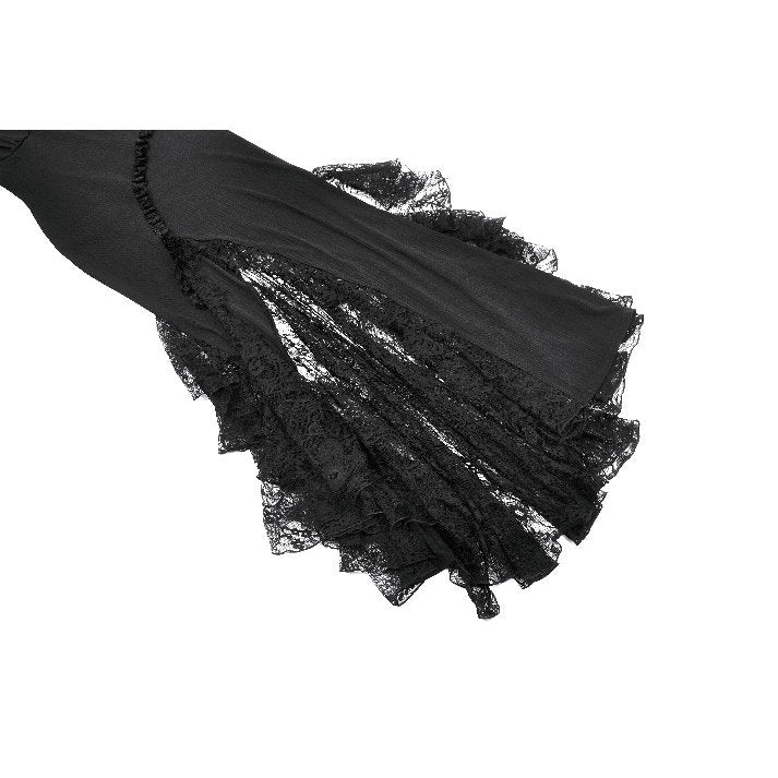 This dress is as bewitching as it is beautiful. With a plunging neckline and lace bell cuffs, it exudes dark elegance. The high split, accented with lace, adds a touch of dramatic flair. Long sleeves and lace trim complete the gothic aesthetic. Perfect for those who like to add a little magic to their wardrobe.