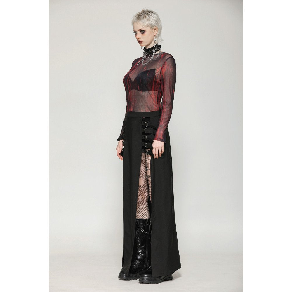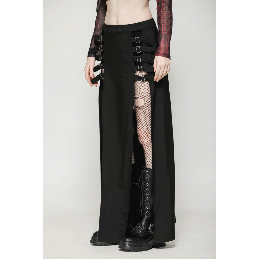 Turn heads and break hearts in the Dark in Love Phoenix Skirt — a dramatic piece that merges sleek goth elegance with post-apocalyptic edge. This high-waisted maxi skirt features ultra-high front slits secured with multiple faux leather buckle straps, creating a bold layered look with every step. Pair with fishnets, chunky boots, and an attitude to match.