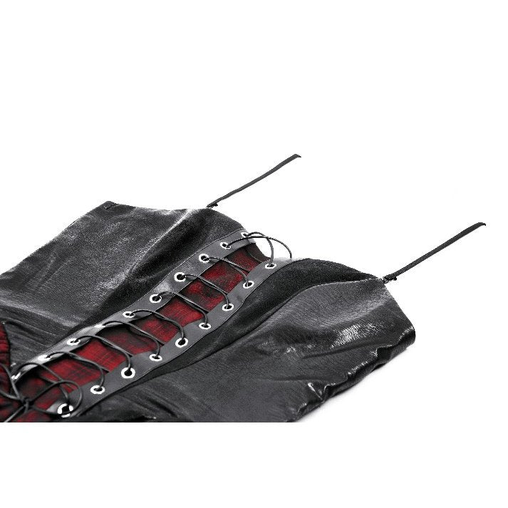 Make a fierce punk statement with the Dark in Love Red Tartan Corset Punk Dress. This eye-catching dress fuses rebellious energy with gothic allure, featuring a bold red tartan print spliced with black faux leather for a dramatic contrast. The structured corset-style bodice is adorned with front grommet details, while the asymmetrical handkerchief hem adds unruly flair. Adjustable shoulder straps offer a custom fit, and the flared skirt brings movement and drama. Perfect for goth nights out, punk festivals, or making an entrance wherever you go.