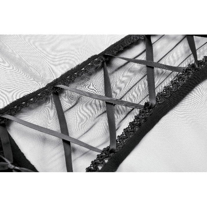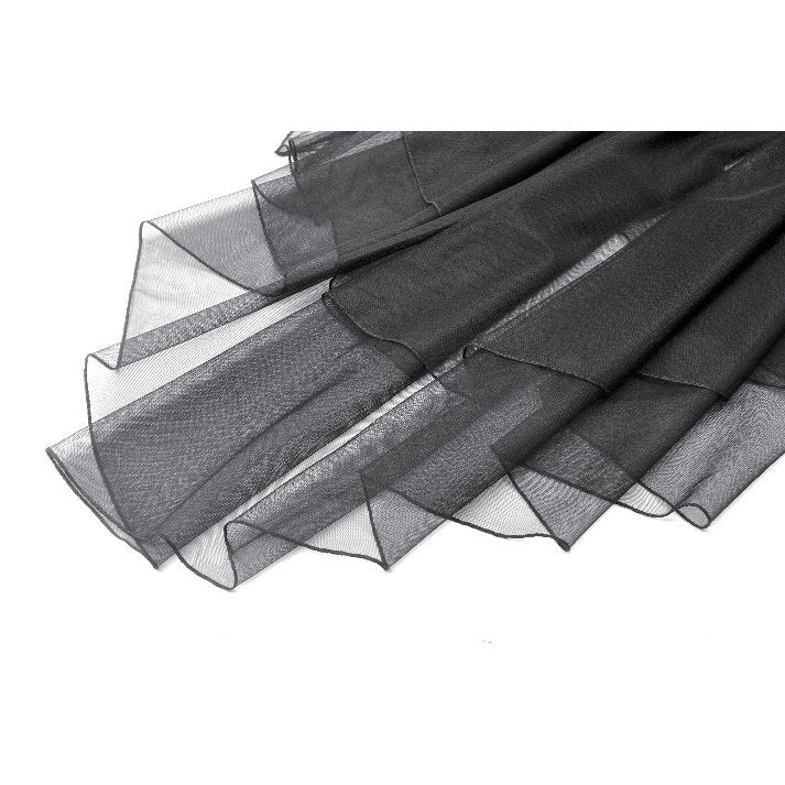 The layered high-low mesh skirt cascades in three flowing tiers, creating a stunning sense of movement. The mix of opaque and sheer panels adds depth and allure, perfect for evening events, gothic balls, or alternative weddings.