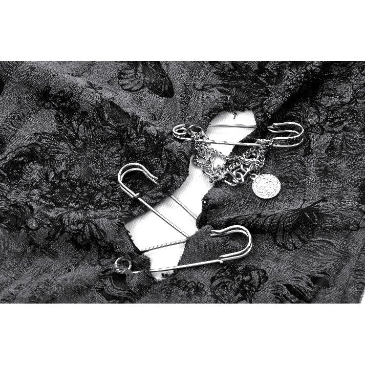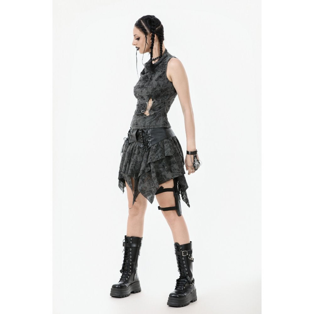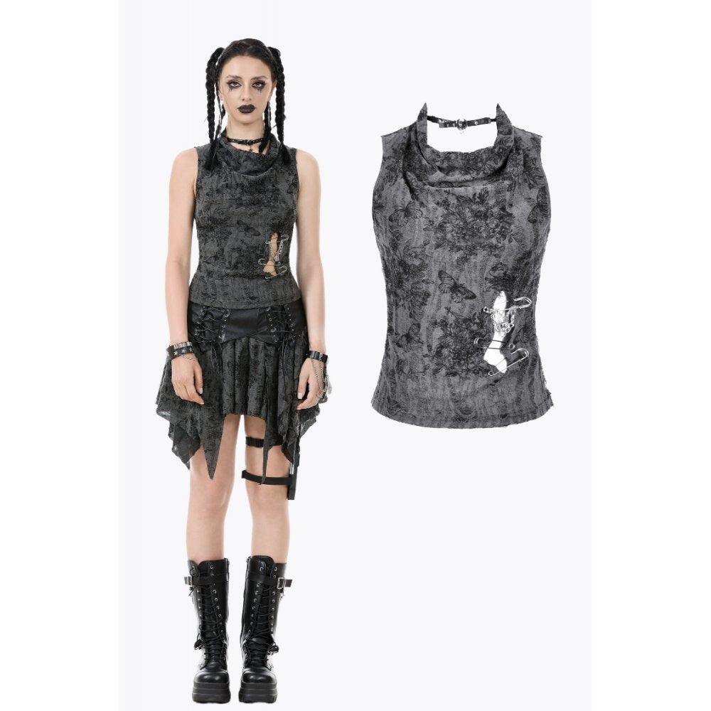 Unleash dark whimsy with the Dark in Love Shredded Butterfly Print Halter Goth Top – Grey. This sleeveless tank top features a distinctive burnout texture in smoky grey, overlaid with delicate butterfly and floral motifs. A subtle cowl neckline paired with a faux leather halter strap adds structure and a touch of fetish-inspired detail. The standout feature is the distressed front slash, held together with a metal clasp, while the lower hem boasts a printed white doll graphic with edgy safety pin accents. Perfect for pairing with asymmetrical skirts, faux leather trousers, or layered under harnesses for a full gothcore look.