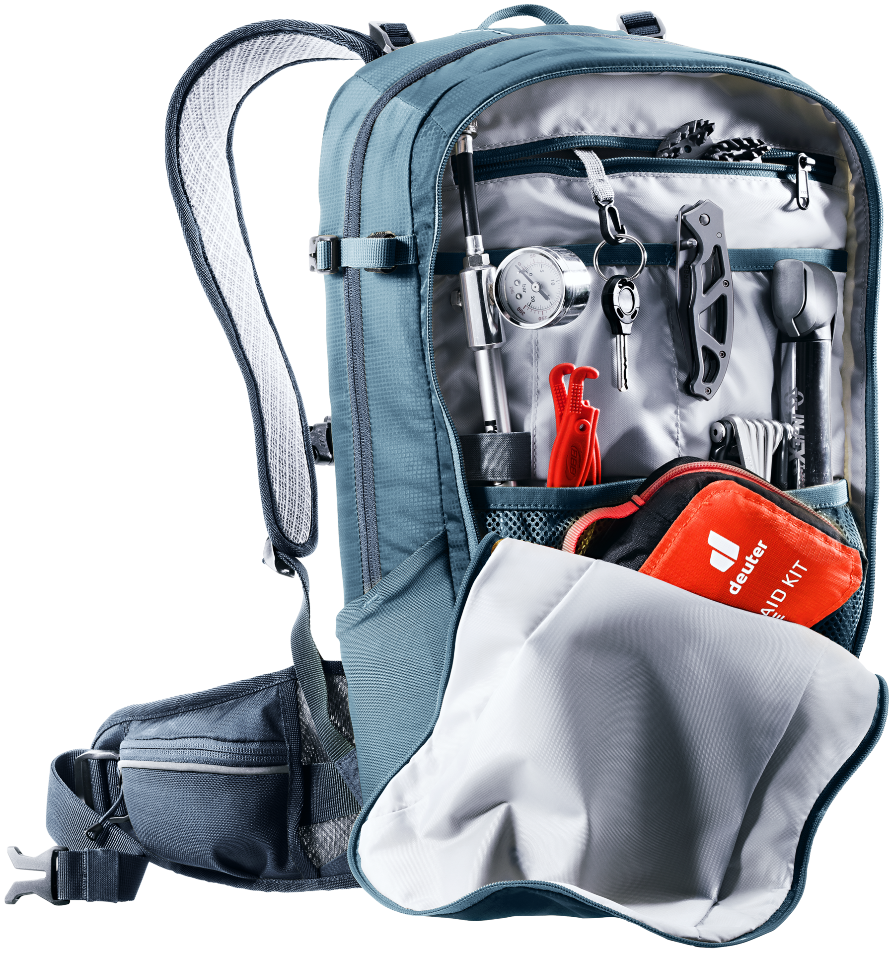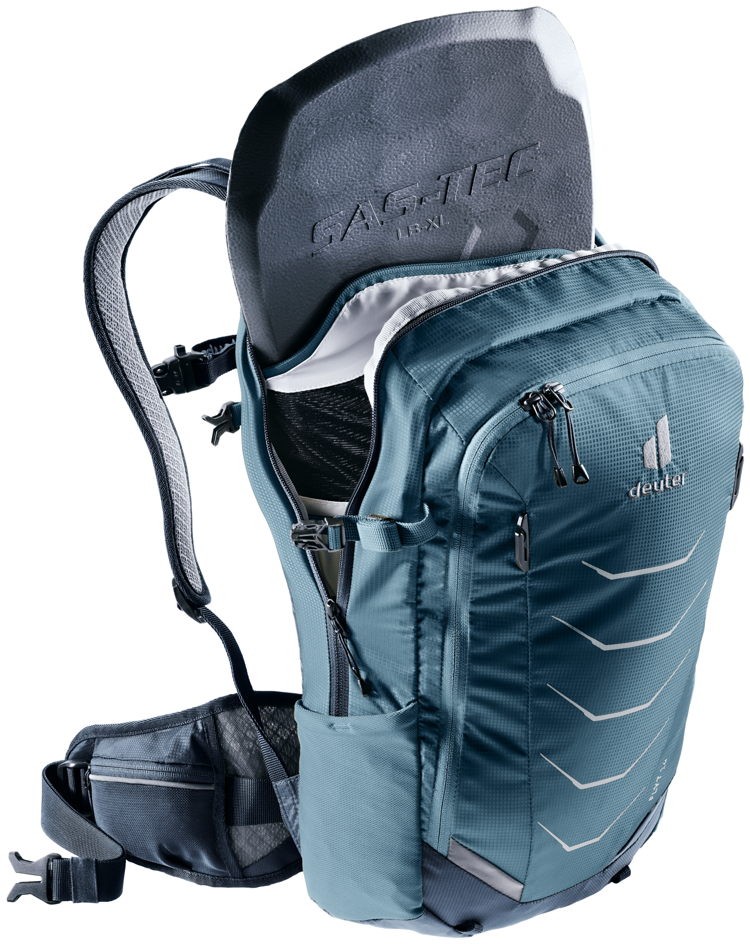 Stripped to the basics, the updated Flyt retains all the necessary features for a long day on the trails: Buckles for attaching a half-shell helmet, side compression straps for a full-face helmet and two stowable straps for securing protective gear to the exterior. And let's not forget the TÜV/GS-certified back protector, easily detachable and offering top-notch protection in case of any mishaps. The Deuter Airstripes back system ensures superior airflow along the back.