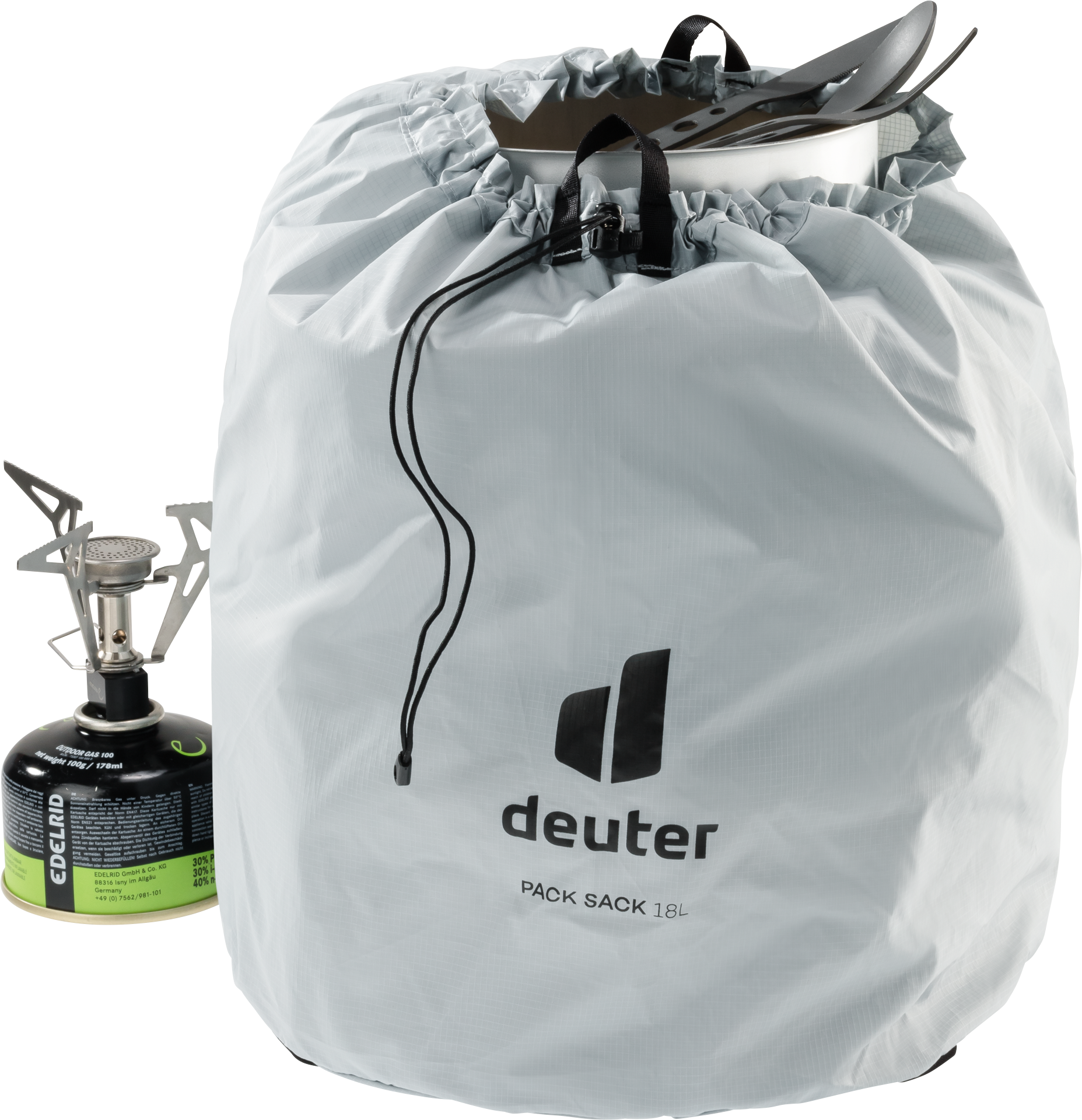 Get organized with ease using the dirt-resistant fixed draw cord stopper and two practical loops of the Deuter Pack Sack 18 Camping Stuffsack - Tin. Its grab handle on the base makes it easy to hang and transport, while fitting camping cookware up to 28 cm in diameter.