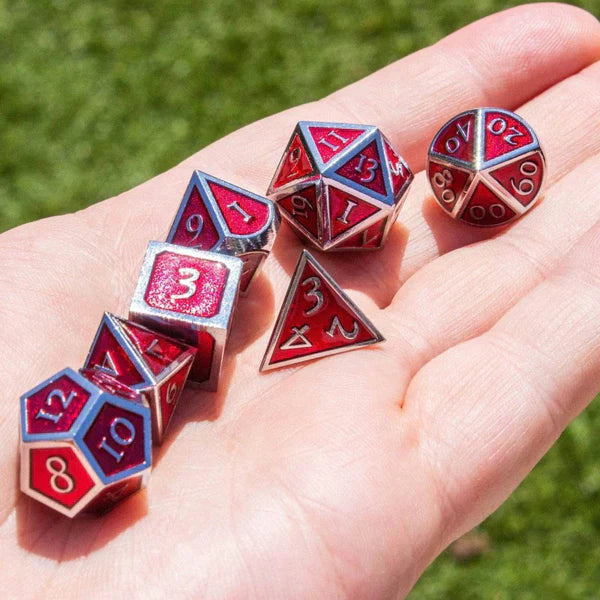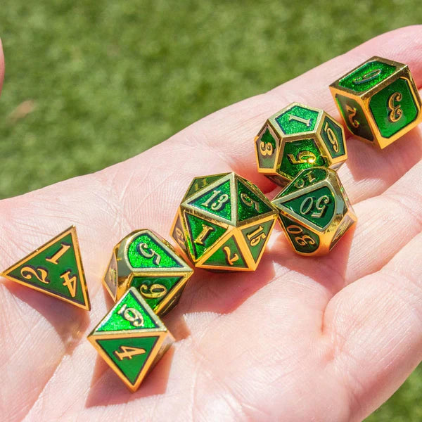 But what sets our Mystery Metal Dice apart from the rest? It's the element of surprise! With each order containing an assortment of 7 meticulously crafted dice, you'll never find duplicates to hinder your journey. The excitement of discovering which metallic treasures you'll receive adds an extra layer of intrigue to your gaming sessions.
