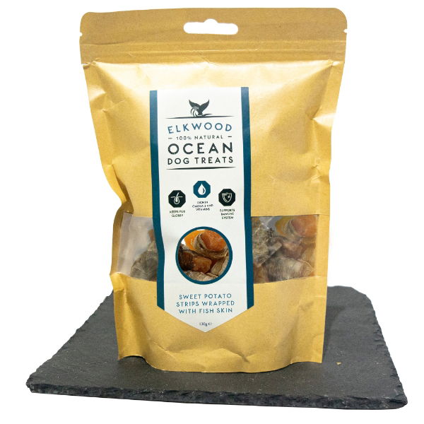 A natural healthier treat for your dog, our Sweet Potato Strips Wrapped with Fish Skin are low in fat and high in fibre to complement your pet's diet and support a healthy digestive system. Using only repsonsibly sourced fish and delicious sweet potatos these are naturally ow in fat and contain essential vitamins, B6, C, and A which support a healthy coat and skin. Fish skin is a delicious and healthy addition to your pet's diet. It contains protein and essential omega-3 fatty acids, nutrients that play a key role in cardiovascular health, cell repair, and supporting the immune system. Perfectly sized for a training your pups, on the go or an after dinner treat!