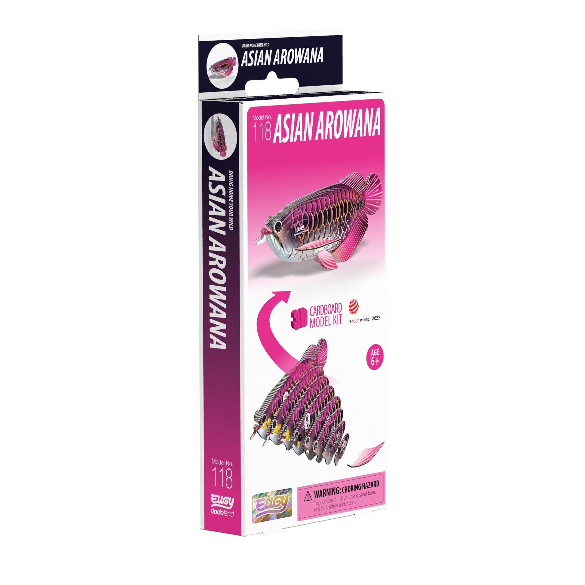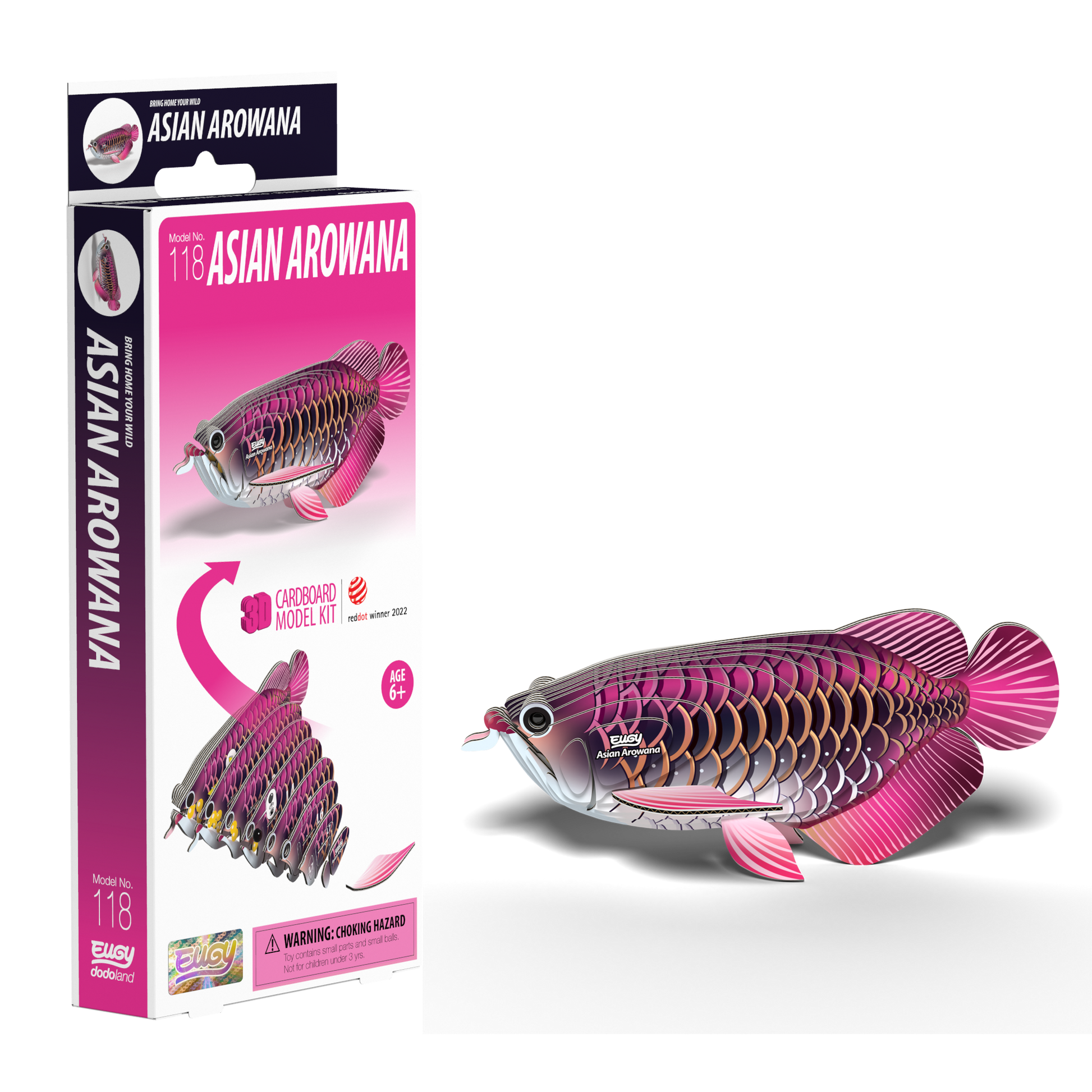The Eugy Asian Arowana is a 3D puzzle made from cardboard, designed for children ages 4 and up.