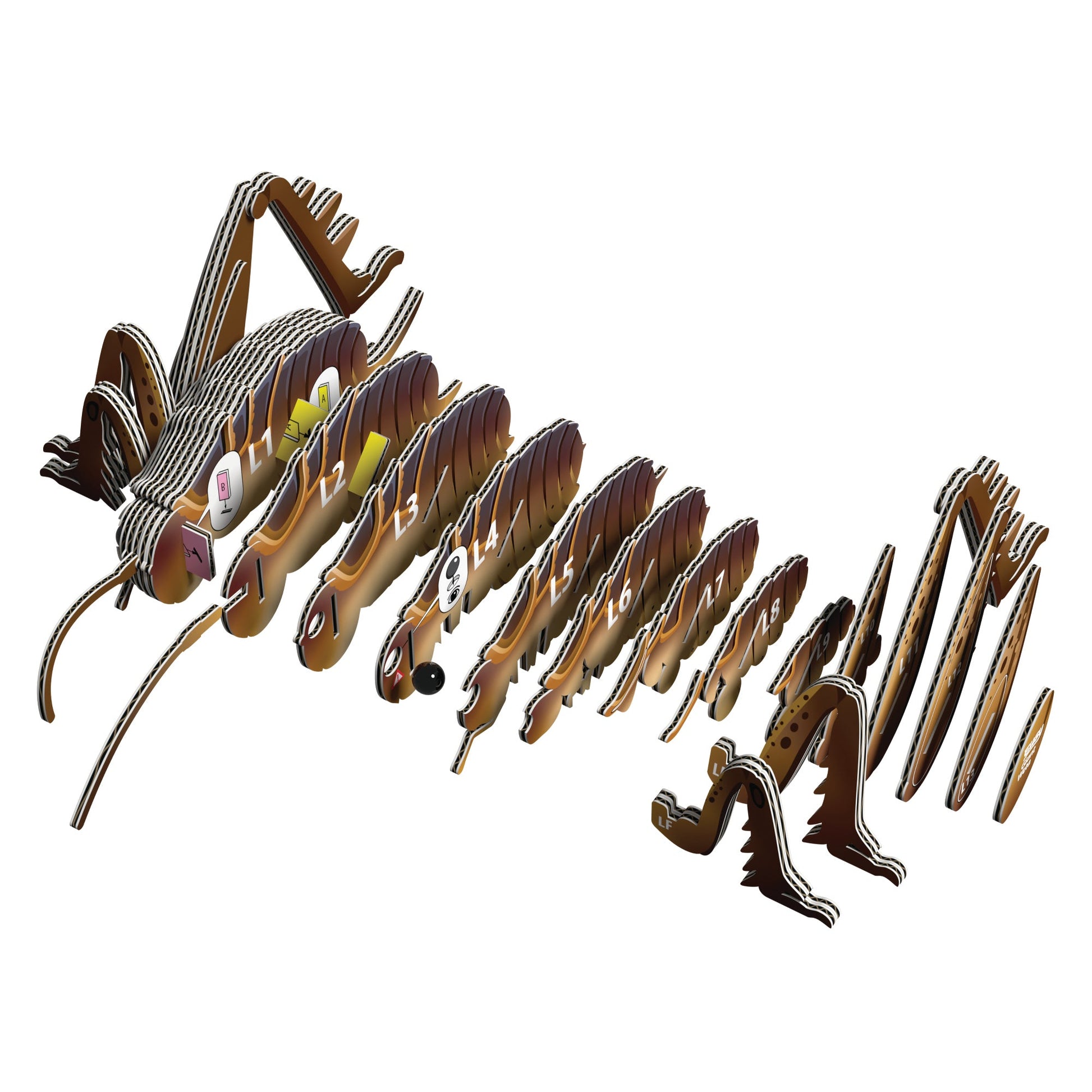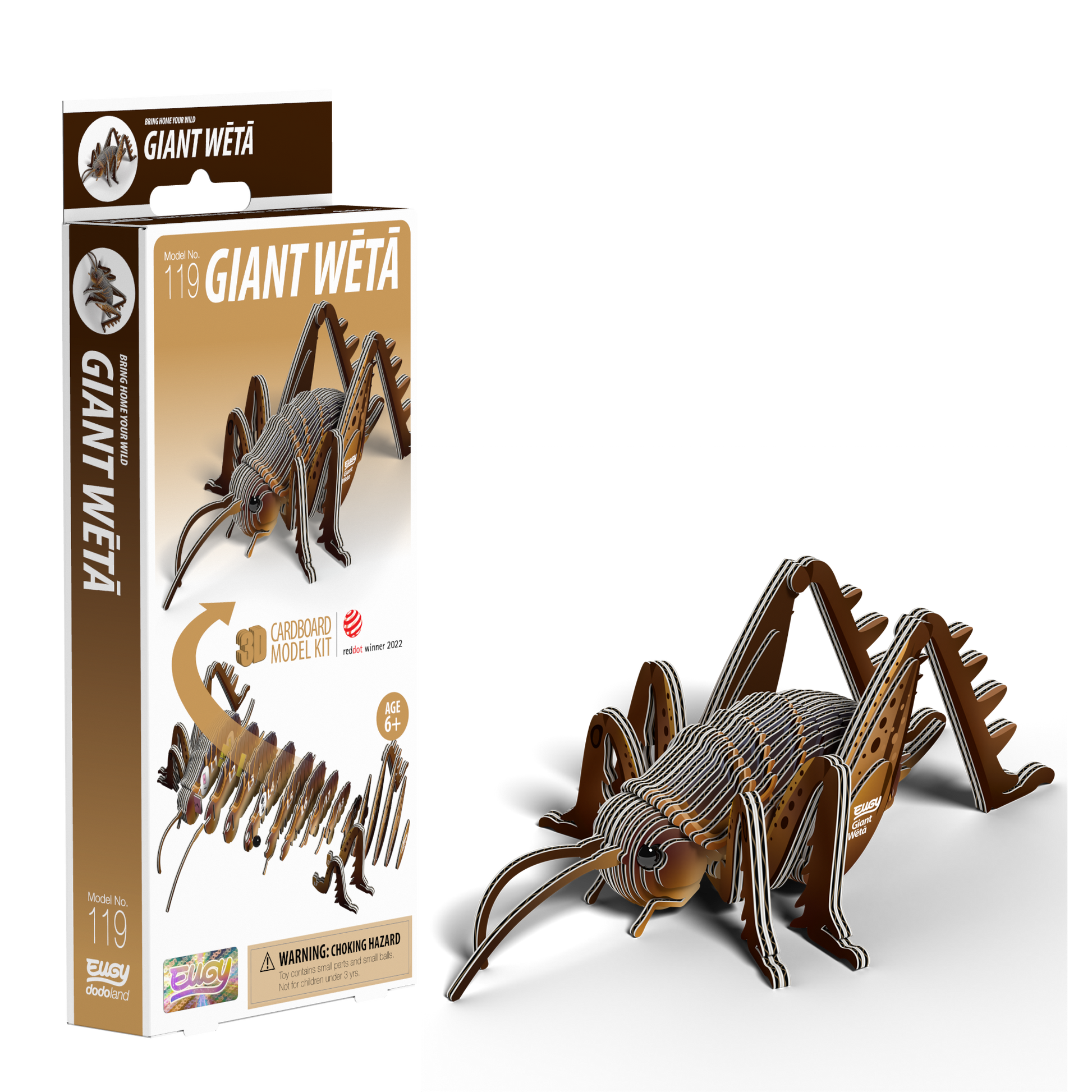 The Eugy Giant Weta is a 3D puzzle made from cardboard, designed for children ages 4 and up.