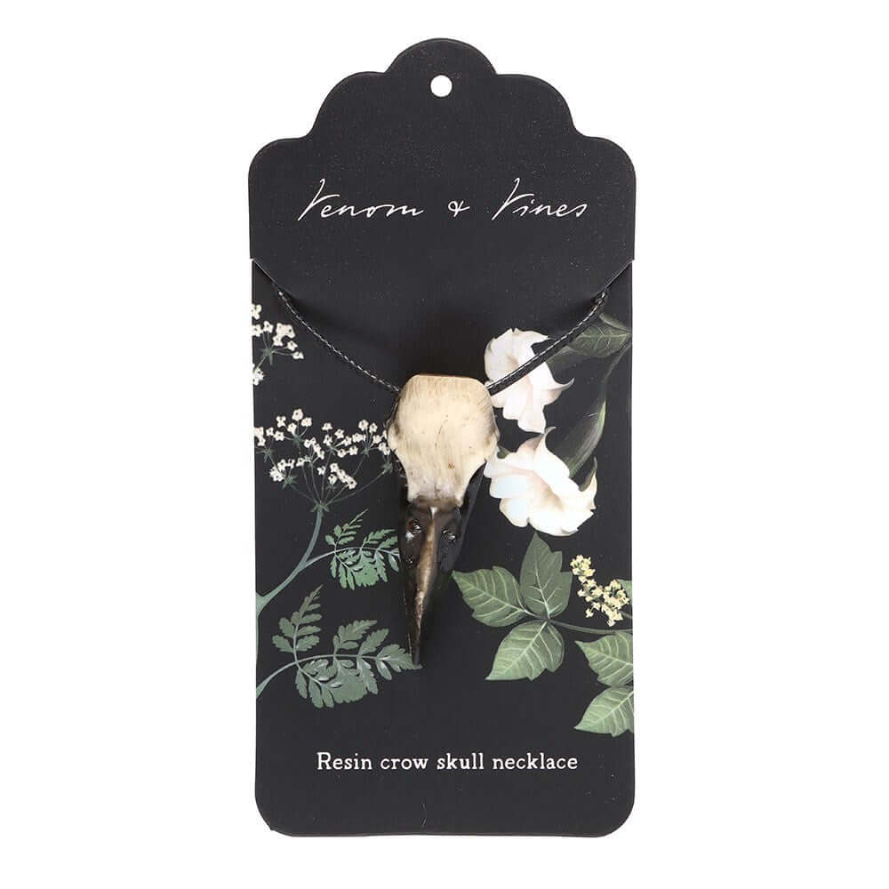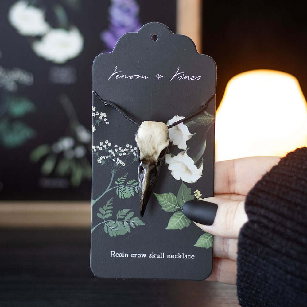 Embrace your mysterious side with this playful resin crow skull necklace, hanging from a sturdy PU cord. It’s the perfect gothic twist to brighten up any outfit and catch curious glances. This unique piece from the Venom and Vines collection adds a dash of dark charm to your jewellery box.