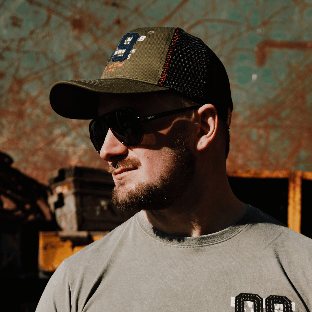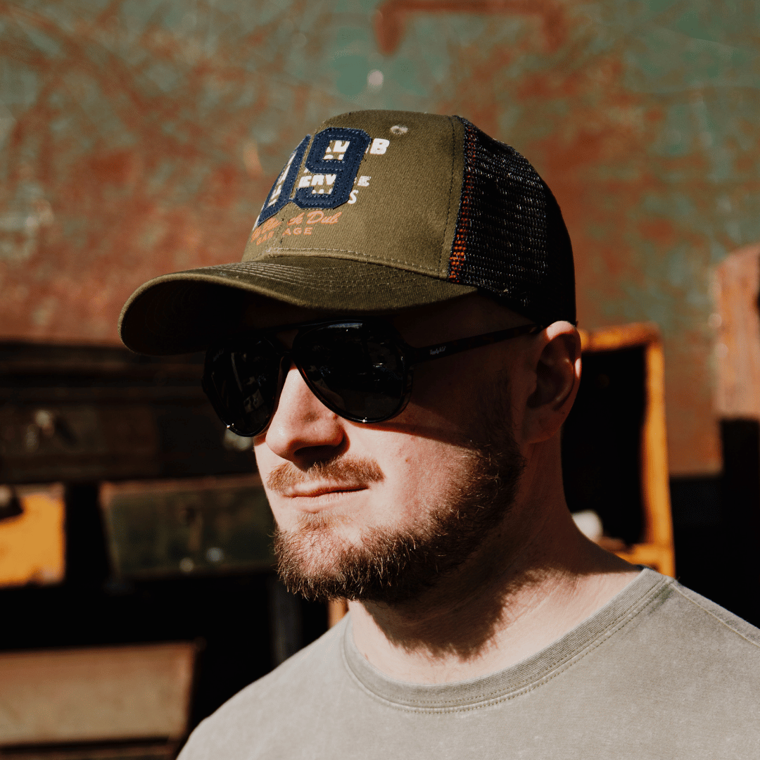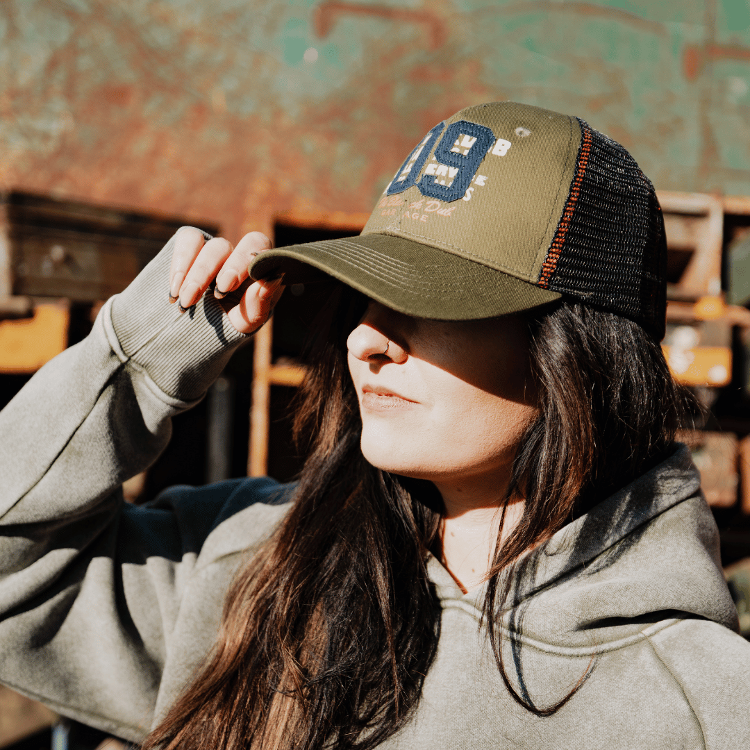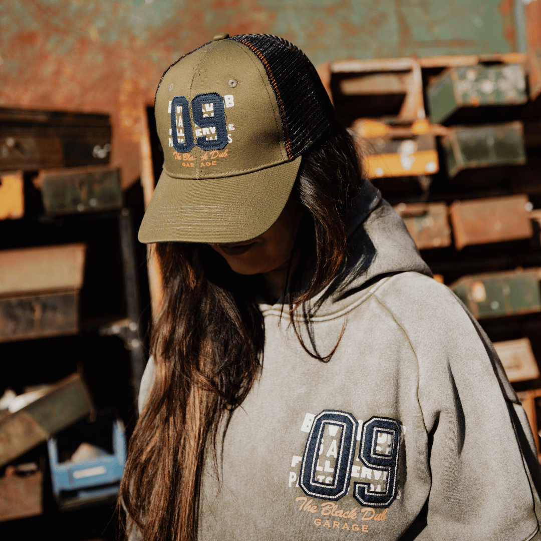 This cap features a deep green cotton front and peak, paired with a black mesh back for that classic trucker style and all-day breathability. The front showcases a clean white Parts & Spares print, overlaid with a rugged black '09' appliqué, frayed and softened through our signature vintage wash for that well-worn, retro feel.