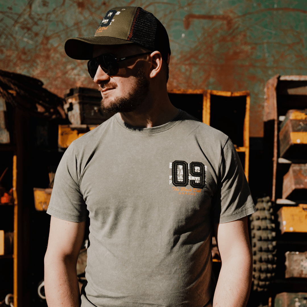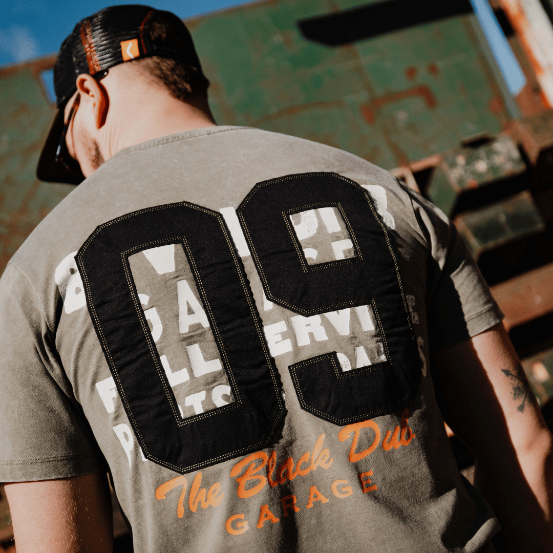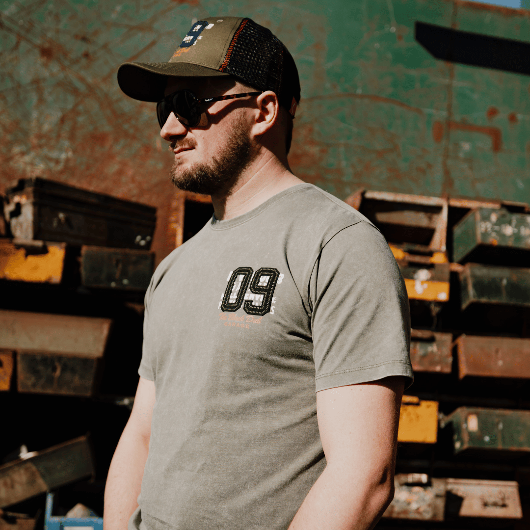 Across the back is a white and orange print pulled straight from the garage floor — rugged, raw, and bold. Sitting over that is the real standout: a massive ‘09’ appliqué, stitched from a second layer of fabric directly onto the design underneath. This process, known as Applicae, creates a raised, tactile, one-off finish — no two tees are quite the same. You can’t fake this kind of craftsmanship.
