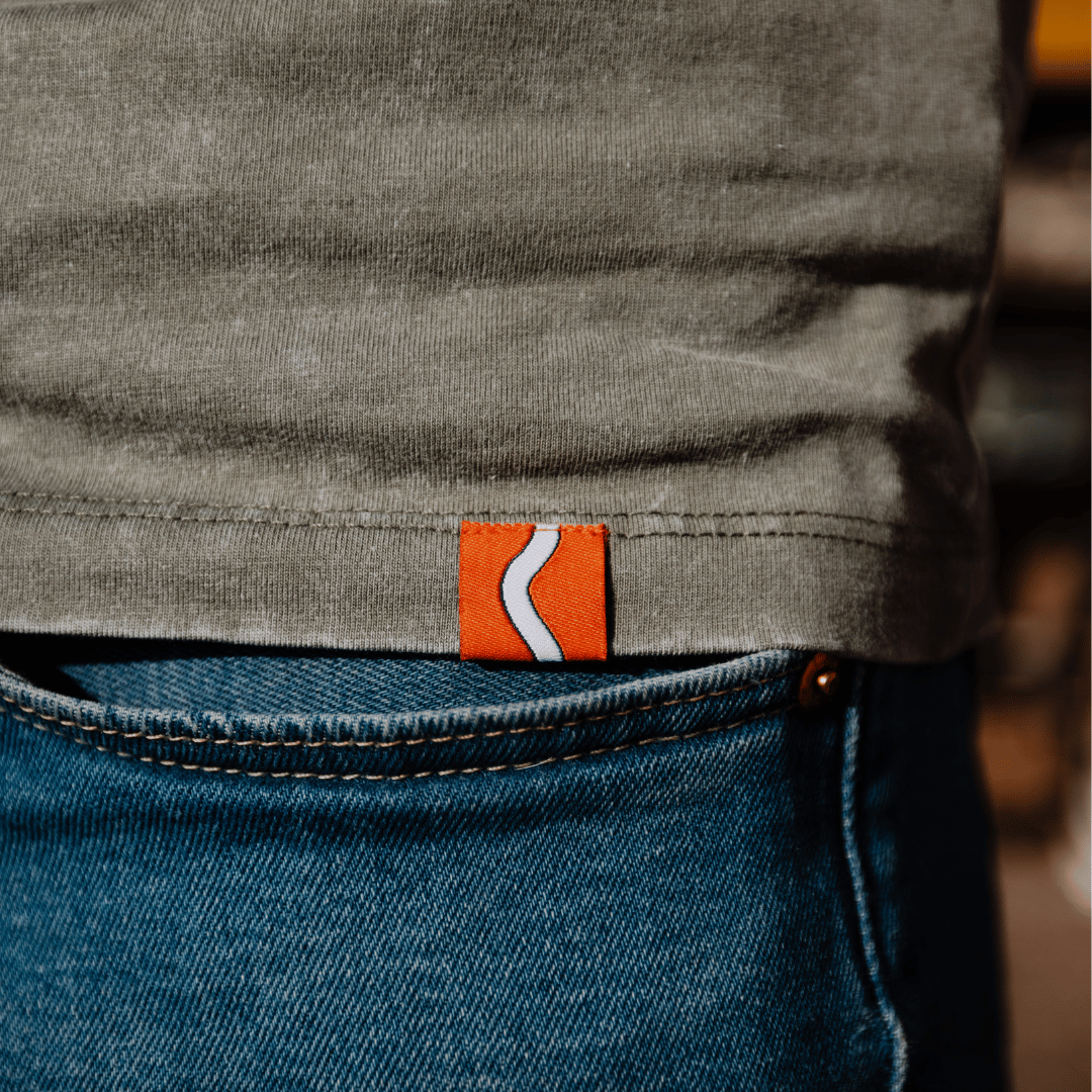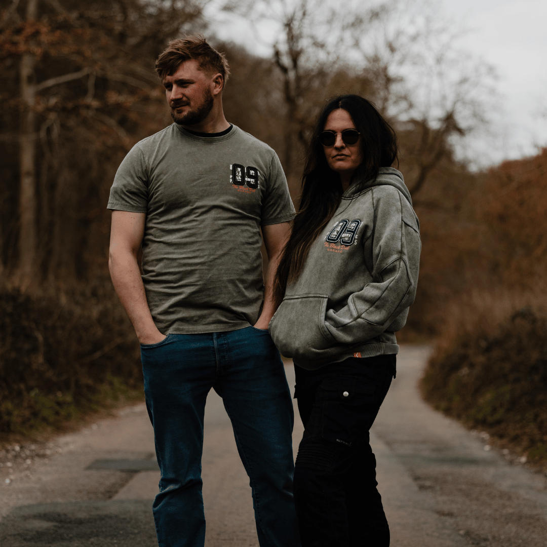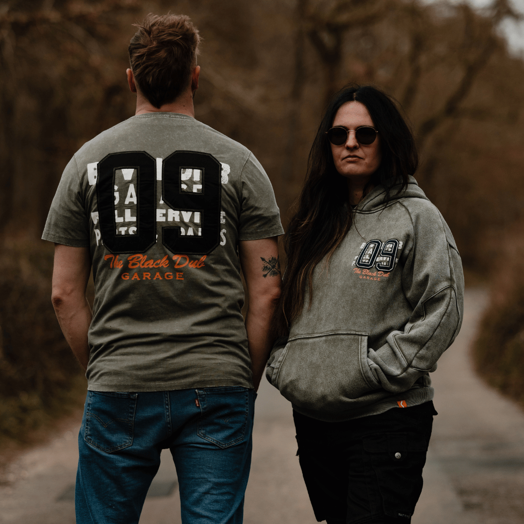 Across the back is a white and orange print pulled straight from the garage floor — rugged, raw, and bold. Sitting over that is the real standout: a massive ‘09’ appliqué, stitched from a second layer of fabric directly onto the design underneath. This process, known as Applicae, creates a raised, tactile, one-off finish — no two tees are quite the same. You can’t fake this kind of craftsmanship.