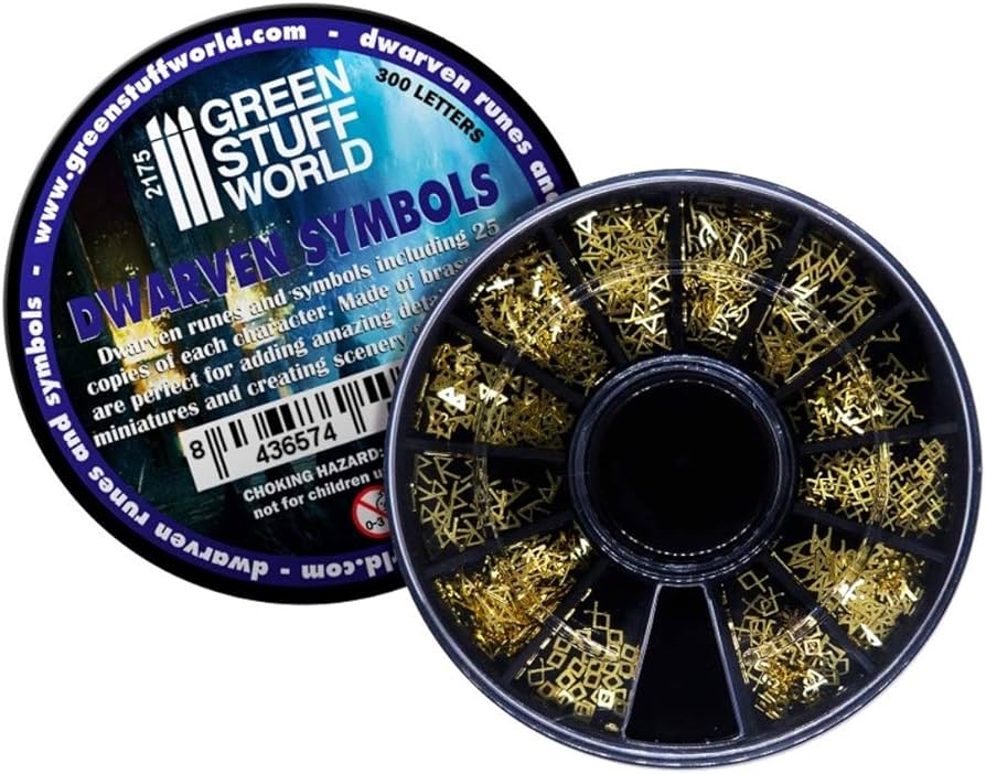 Collection of 300 dwarven or viking themed runes, symbols and signs made of brass. There are 12 different types to choose from, separated in different compartments. They are perfect for adding details to armour, weapons and banners of your models and miniatures or for decorating dioramas. We recommend using cyanocrylate glue in small quantities.
