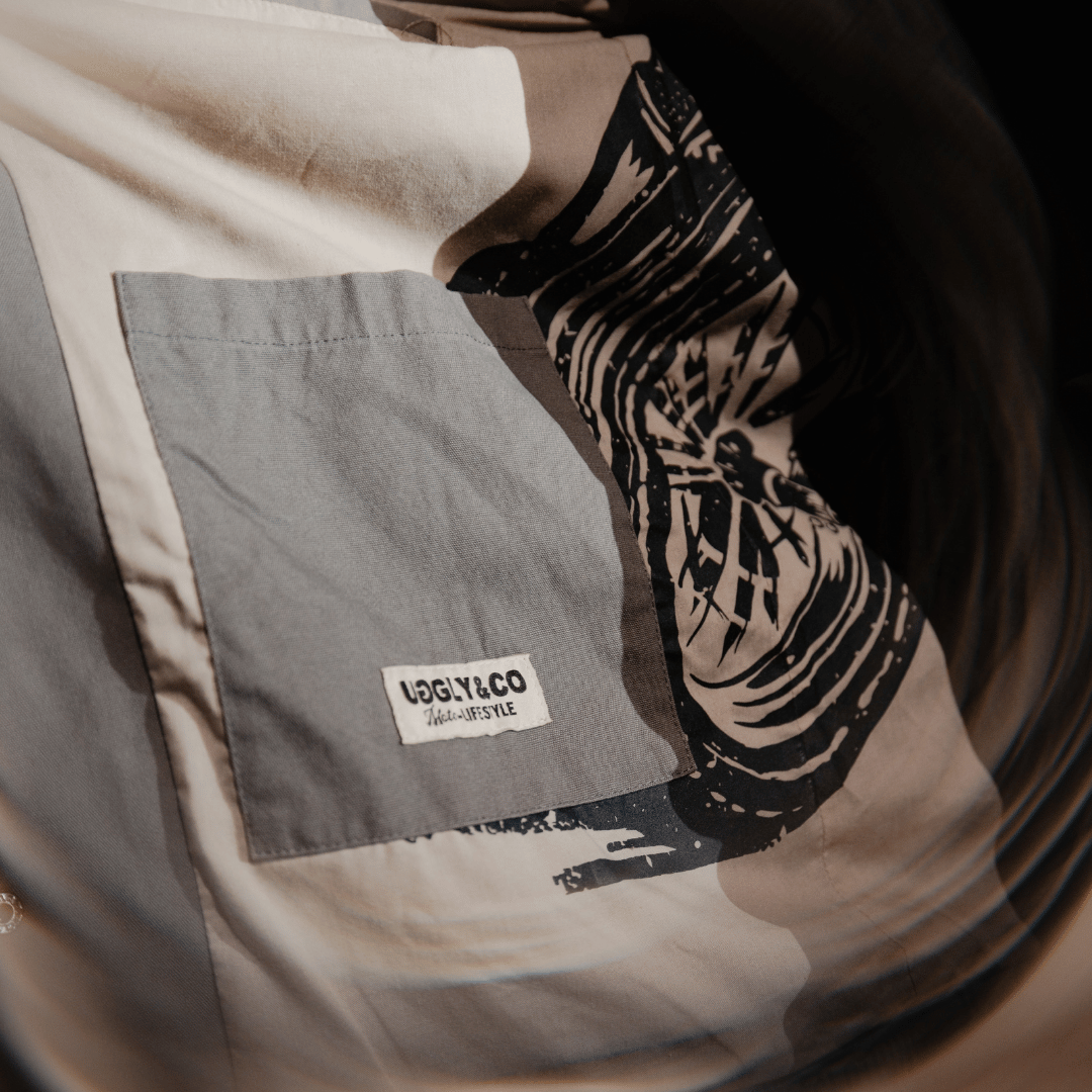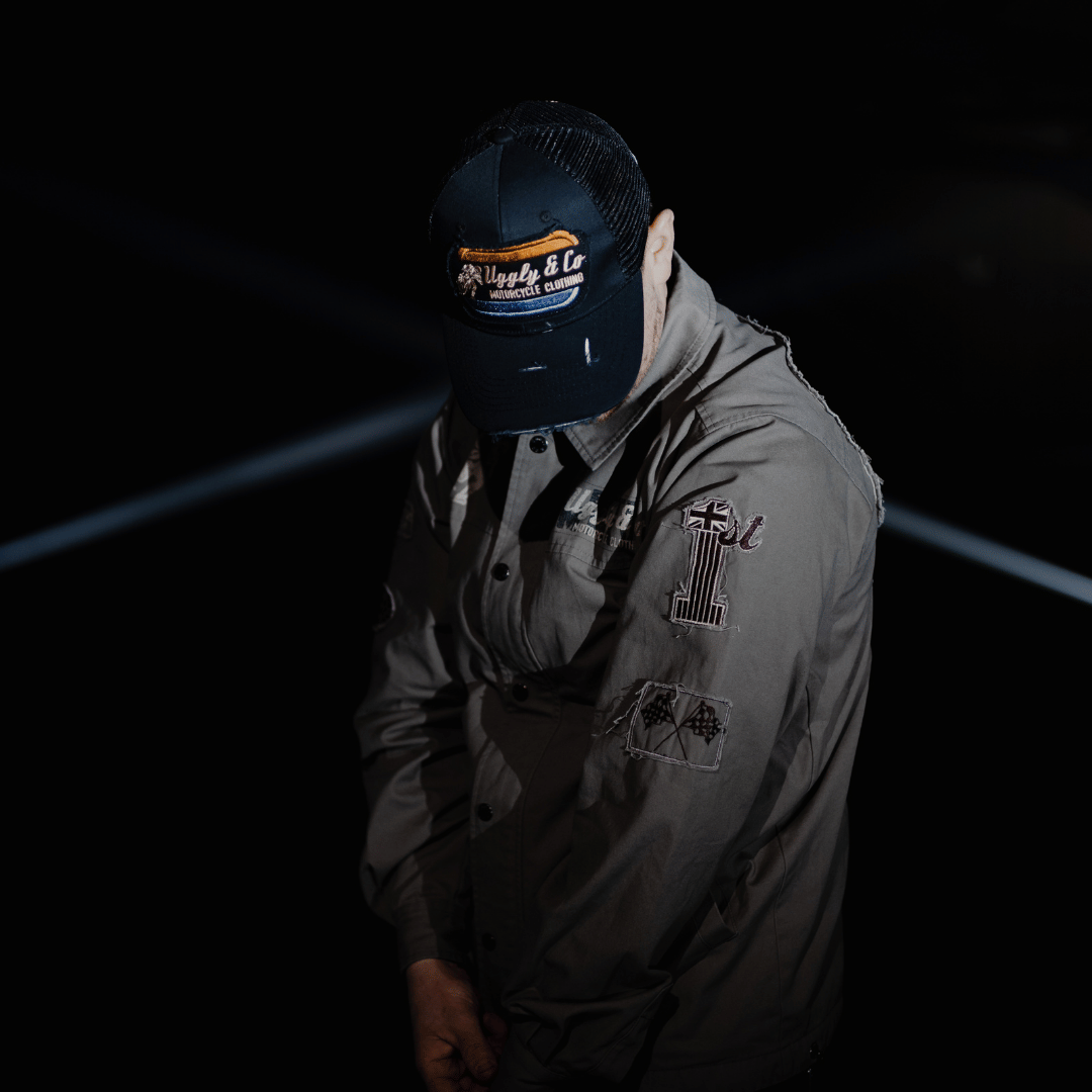 Designed with both style and function in mind, the shacket features a dual zip and button-up closure, both branded with Uggly&Co. Every patch has been stitched on for long-lasting durability, with intentional fraying for a vintage, worn-in feel. A carabiner clip at the back allows you to easily carry your cap while riding or walking, adding an extra layer of practicality.