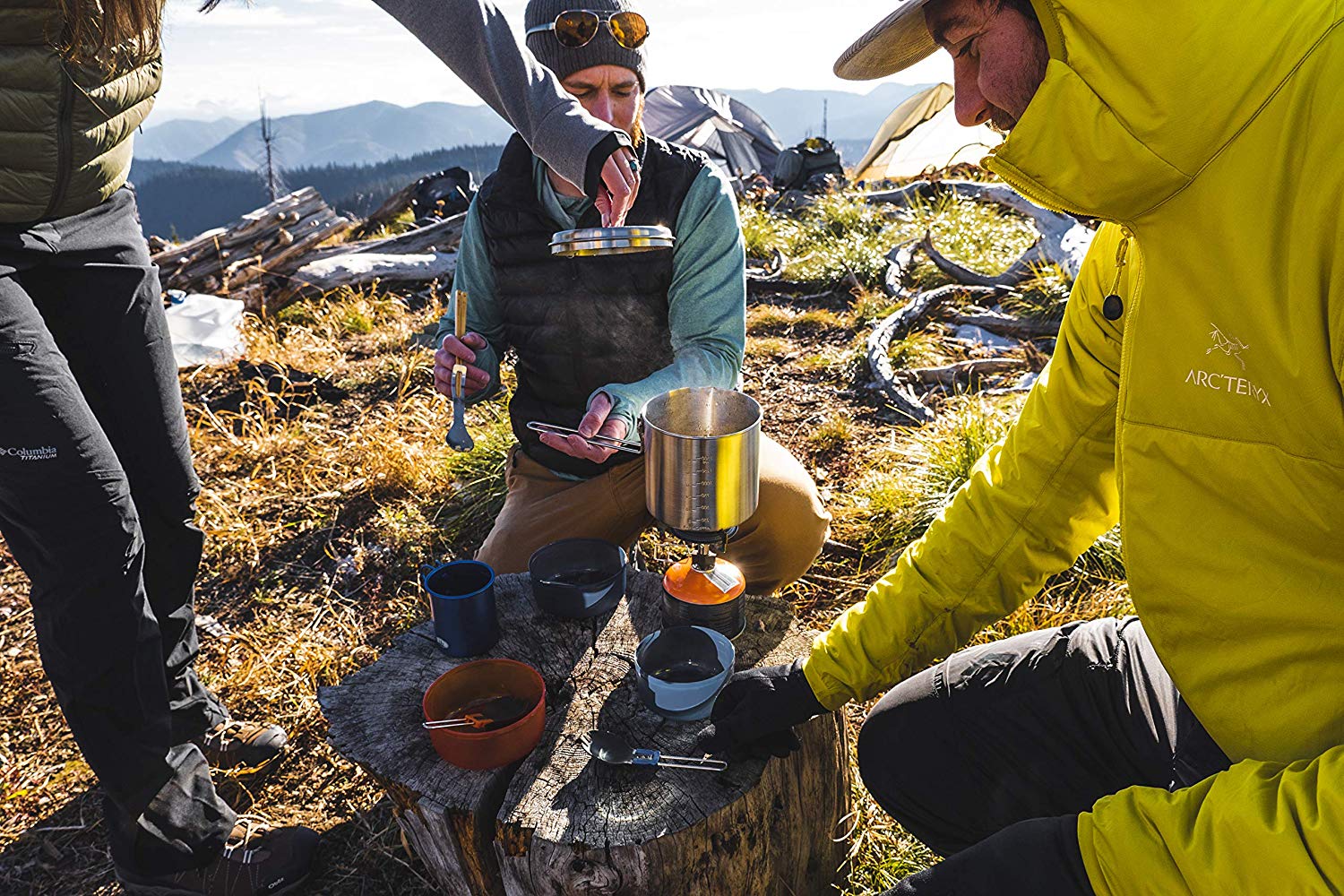 Thanks to its incredible capacity for nesting, the Glacier Stainless Dualist includes insulated mugs, bowls, a pair of folding fork-spoon hybrid utensils, strainer lid, sink sack, handy measurement graduations and a 1.8 L boiler while still leaving room for a stove and 230 g fuel cartridge inside.