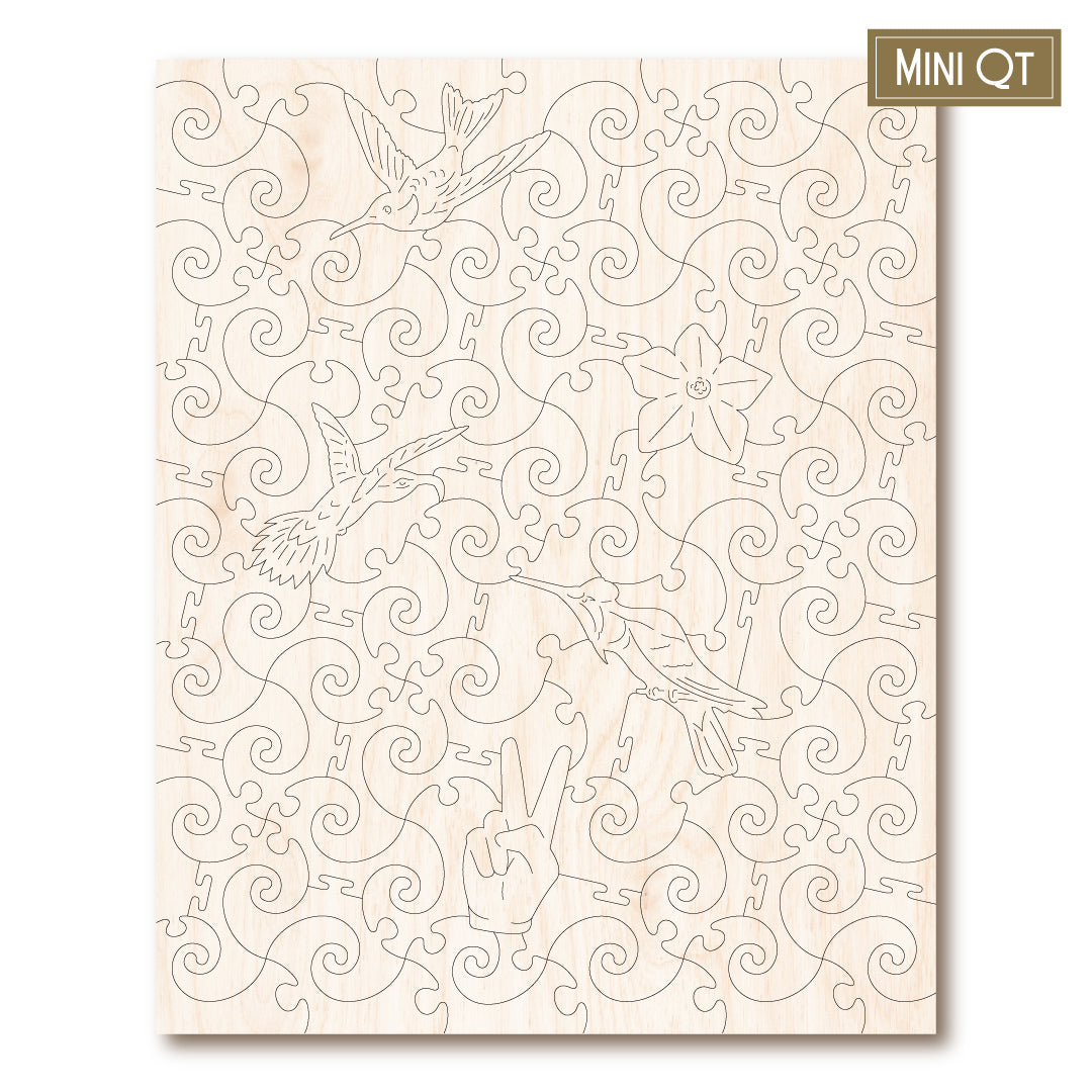Our MINI QT puzzles are laser cut from thick, 4mm plywood and include 5 whimsies - they make a great puzzle snack!