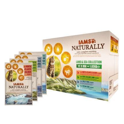 Iams Naturally Land & Sea Adult Cat Food Collection. The IAMS Naturally range provides cats with a 100% complete and balanced diet. The range is made with a selection of highly digestible natural ingredients for visibly healthy strong and happy pets.