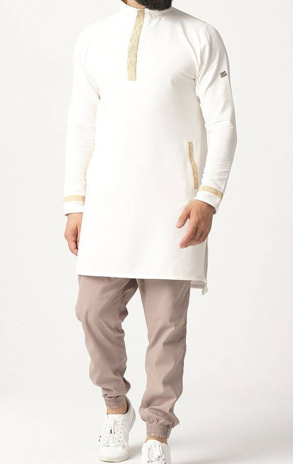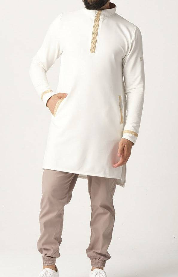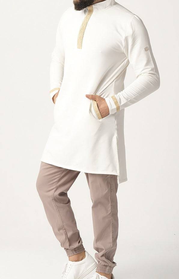 Look simple, clean and elegant in this short Kamisweat. It provides a unique style statement with leisure and comfort. Made fashionably stylish by adding a matching rectangular Greek inspired embroidery design to the collar, side pockets and sleeves. It's an essential outfit for pulling off a sporty or a casual but sophisticated look while saving you time and effort for any occasion. Whether you’re going for a walk, heading to the tennis court or attending an event or a get together, Islamic Men's Short Thobe Kamees Eminence QL is very handy and flexible when styled the right way!