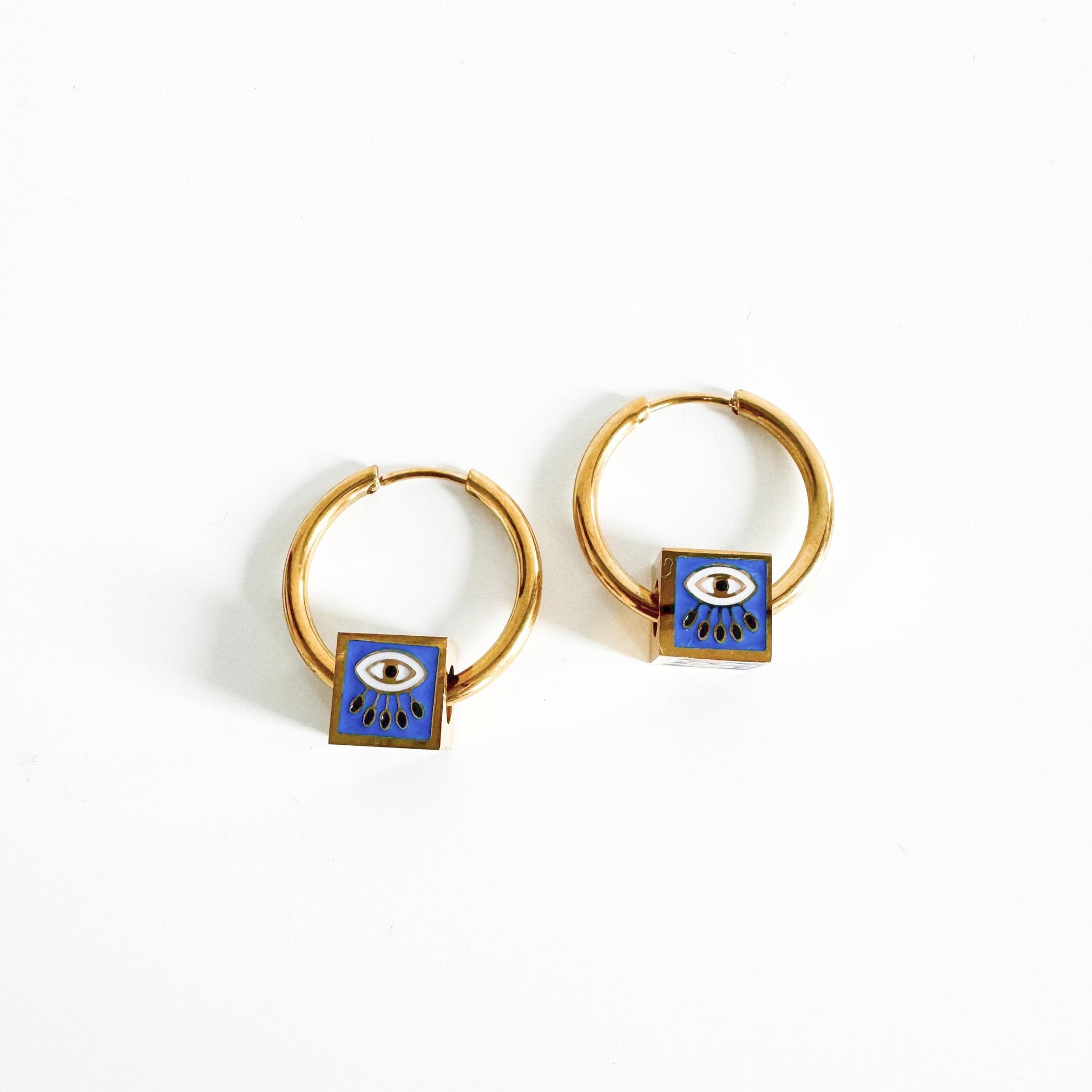 Add a bold touch to your look with these gold hoop earrings, featuring a striking blue enamel evil eye charm. The unique design blends protection and style, making these earrings perfect for daily wear or to elevate any outfit with a pop of color and symbolism.