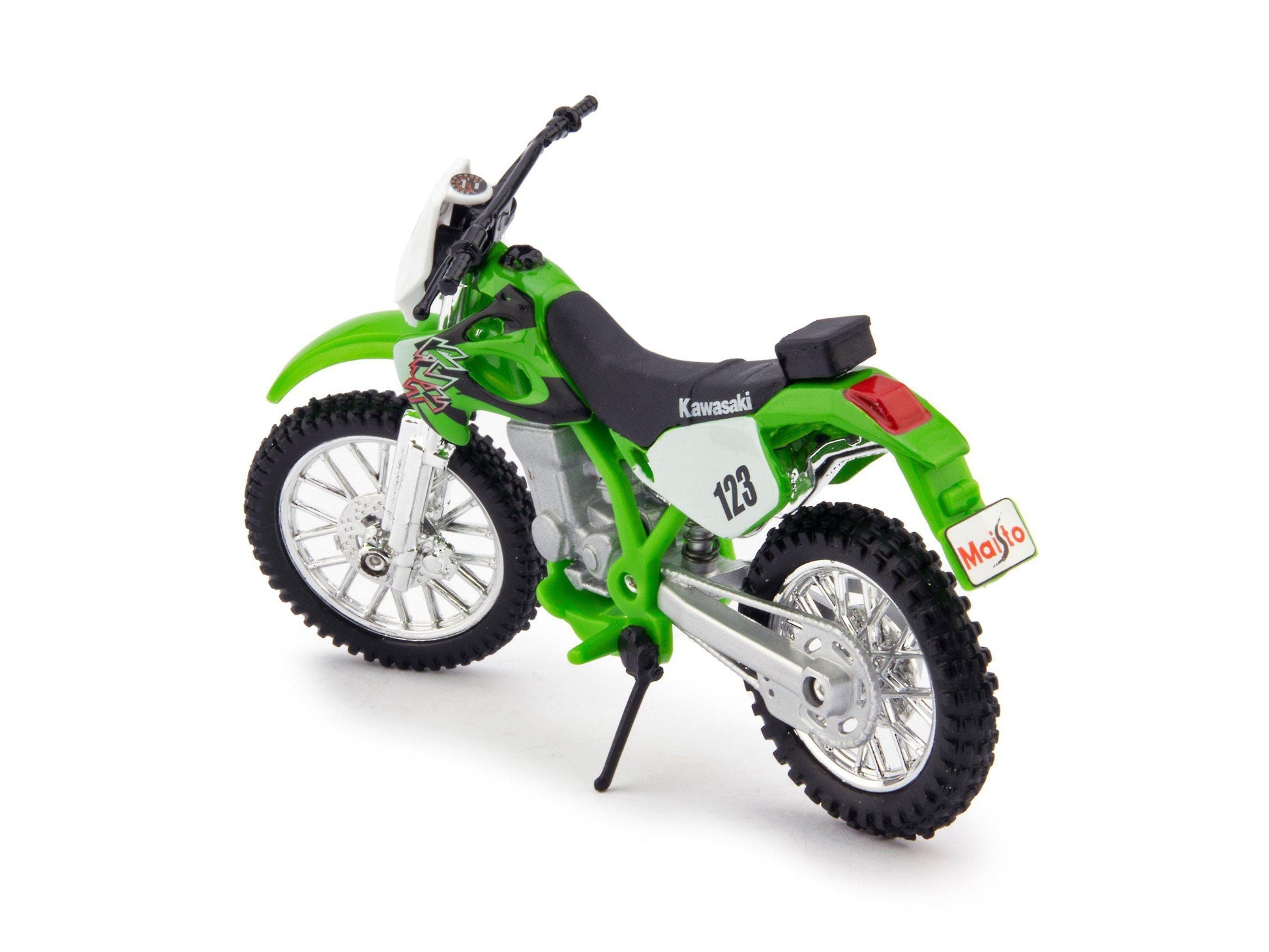 Dirt bike enthusiasts of all ages will love this awesome Kawasaki KLX250SR diecast model motorcycle in 1:18 scale by Maisto®. Faithfully modelled on a bike in a green colour scheme with chrome-effect forks and wheels, it measures approximately 12.5cm in length and is pre-built, ready to be displayed, or played with straight out of the box.