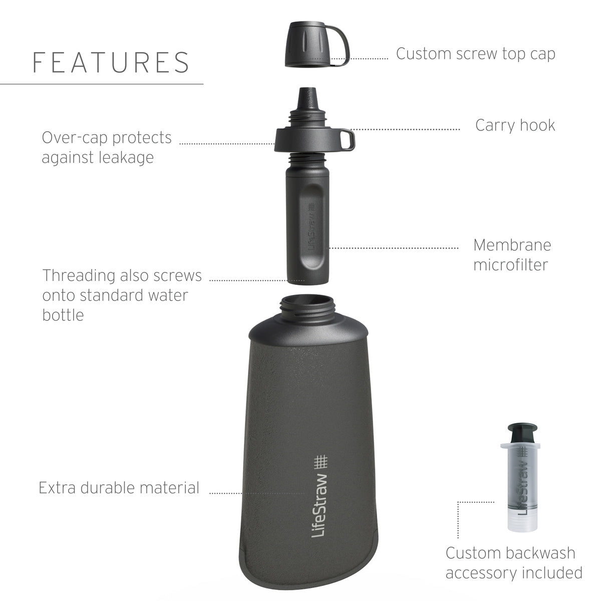 - Includes: LifeStraw Peak Series 650ml collapsible squeeze bottle with screw-top cap and tether, backwash accessory, user manual