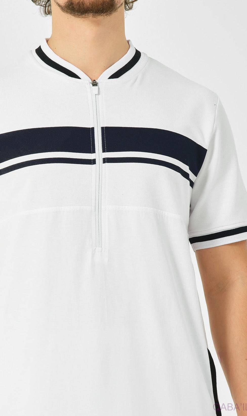 Long Thobe Kamees for Muslim Men QL NV R24 exudes a nautical inspired vibe that has stood the test of time. It's a bi-material, long thobe designed with matching bands on the chest, on the collar and on the sleeves. It's laid-back yet sophisticated and stylish. Anyone can wear it and it works for any occassion! Bon voyage!