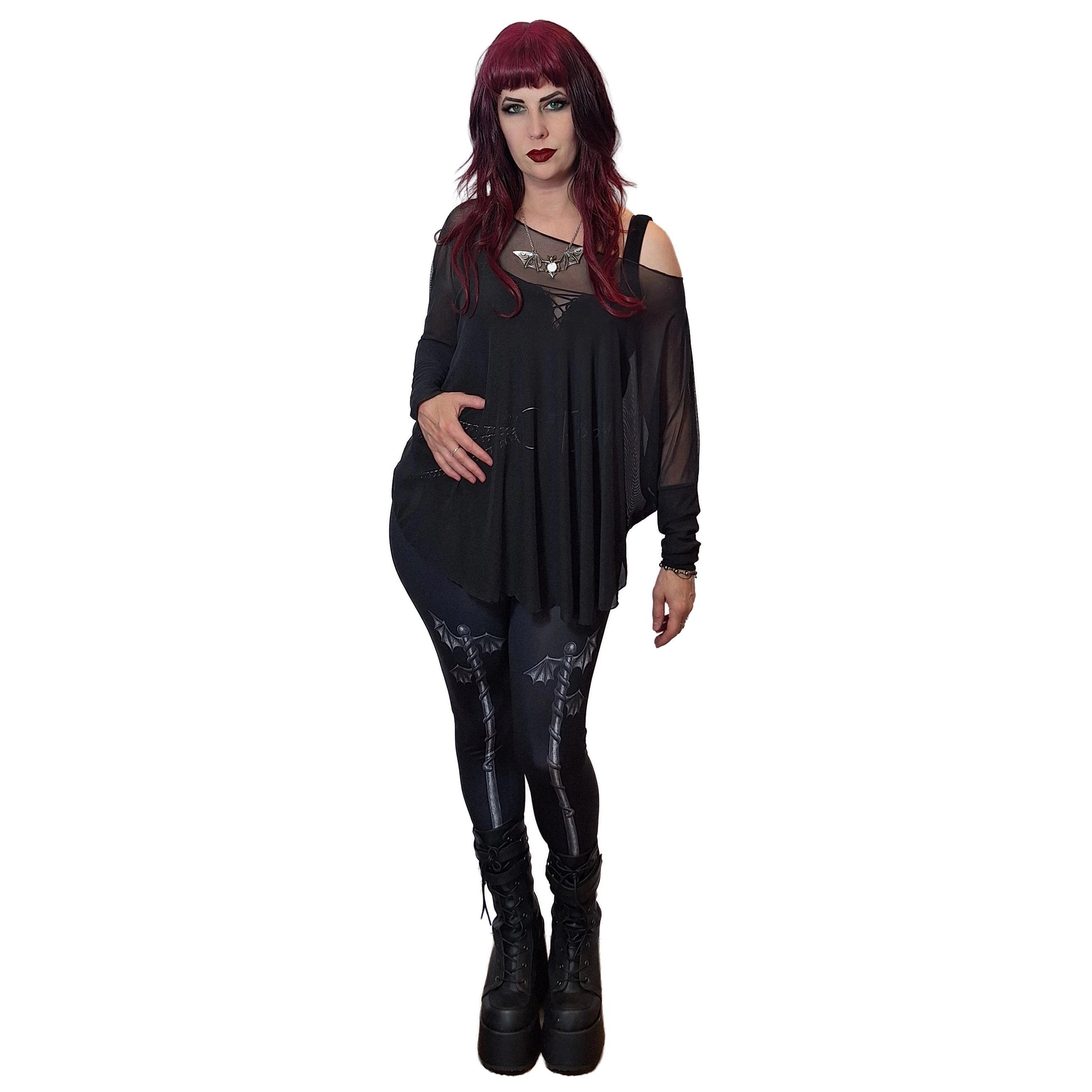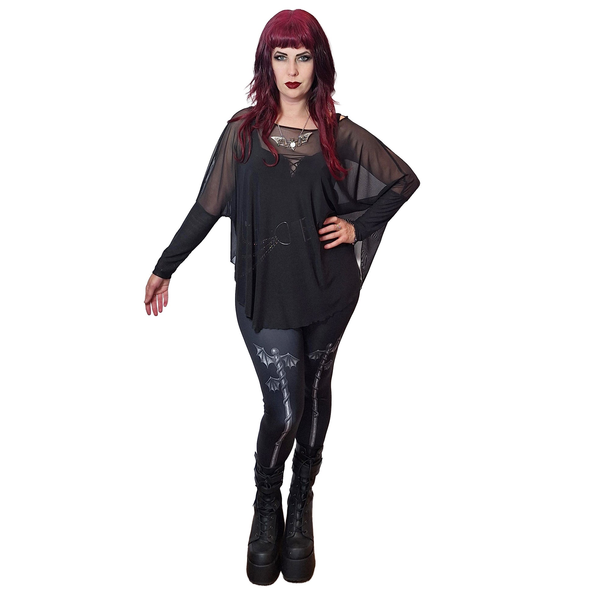 The Circe top features a relaxed circular drape that moves beautifully with you, while the double-layer mesh sleeves add extra texture and depth. Wear it over crop tops, strappy bralettes, corsets, or dresses to transform your outfit with ease. Its versatility makes it just as suited for everyday gothic styling as it is for festival or night-out looks.