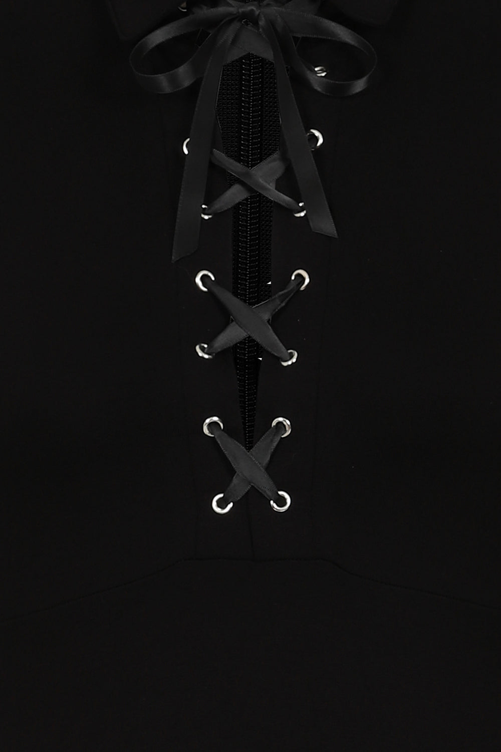 A structured high turn-down collar sits proudly at the neck, creating a bold frame for your face and adding a regal, vintage-inspired edge. The ribbon lace-up bust, threaded through silver eyelets, adds customisable detail and draws the eye downward, balancing softness with strength.