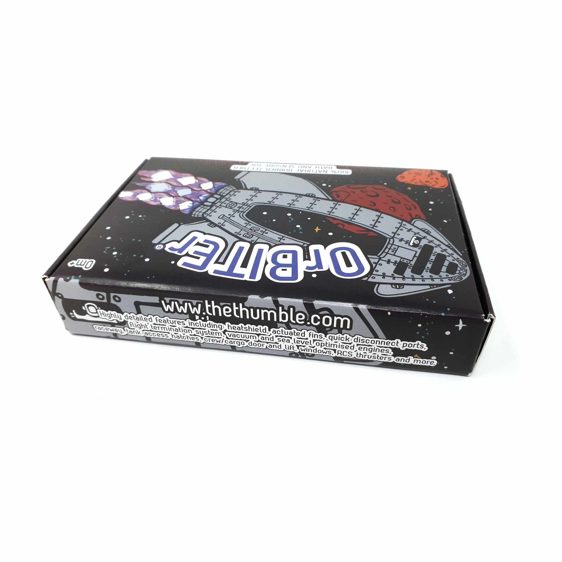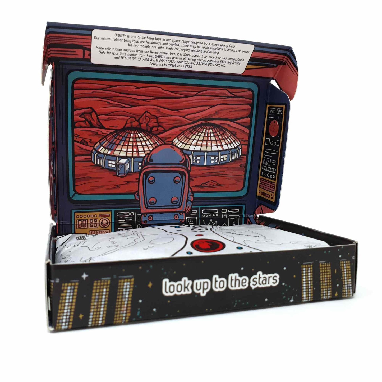 On the outside of the box packaging you’ll see a space scene showing our OrBITEr® rocket orbiting Mars with Phobos and Deimos in the background. You can see from the colour of the exhaust that OrBITEr® is powered by methane and oxygen. Check out the exhaust mach diamonds! On the colourful artwork inside the box you’ll find our AstroGNAW® aboard OrBITEr®. The artwork also has many space related and science fiction film references. What can you find?