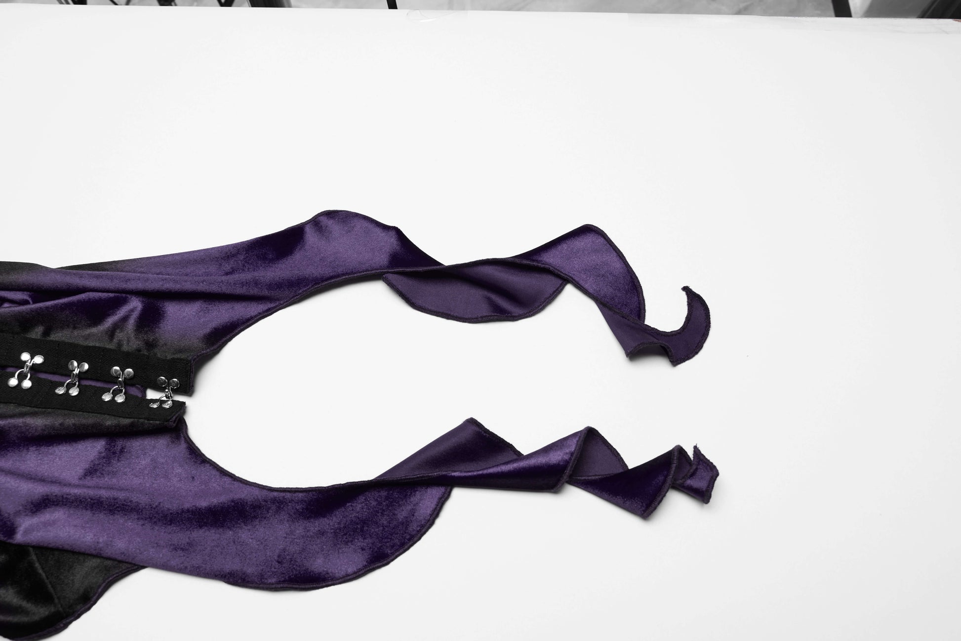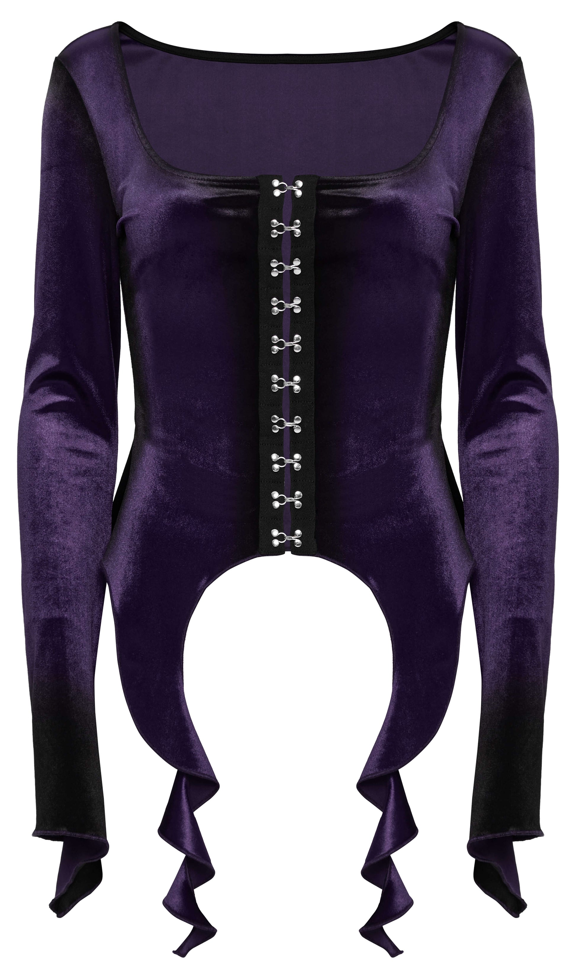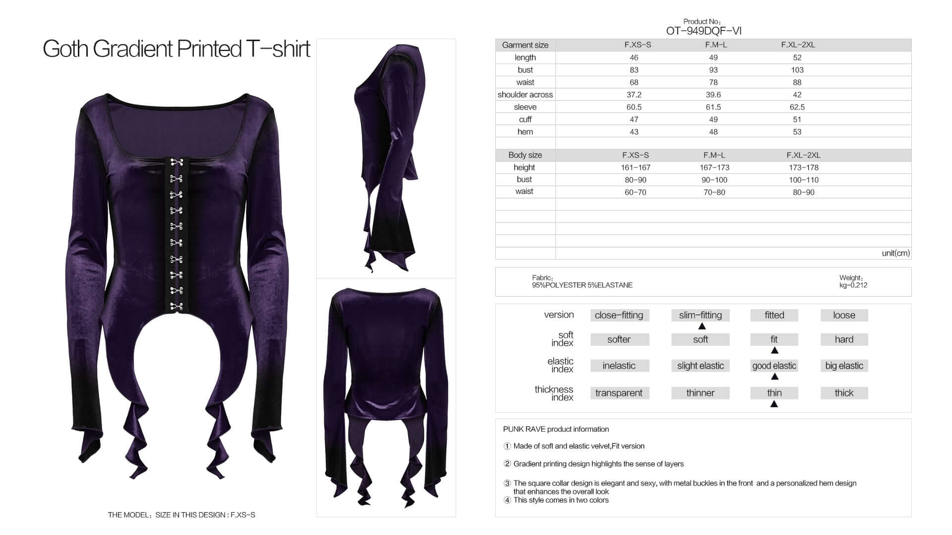 Embrace your edgy side with the Punk Rave Bronwyn Gradient Printed T-shirt! Made of soft and elastic velvet, this fit version showcases a unique gradient printing design that adds dimension to your look. The elegant and sexy square collar features metal buckles and a personalized hem, available in two stunning colors.