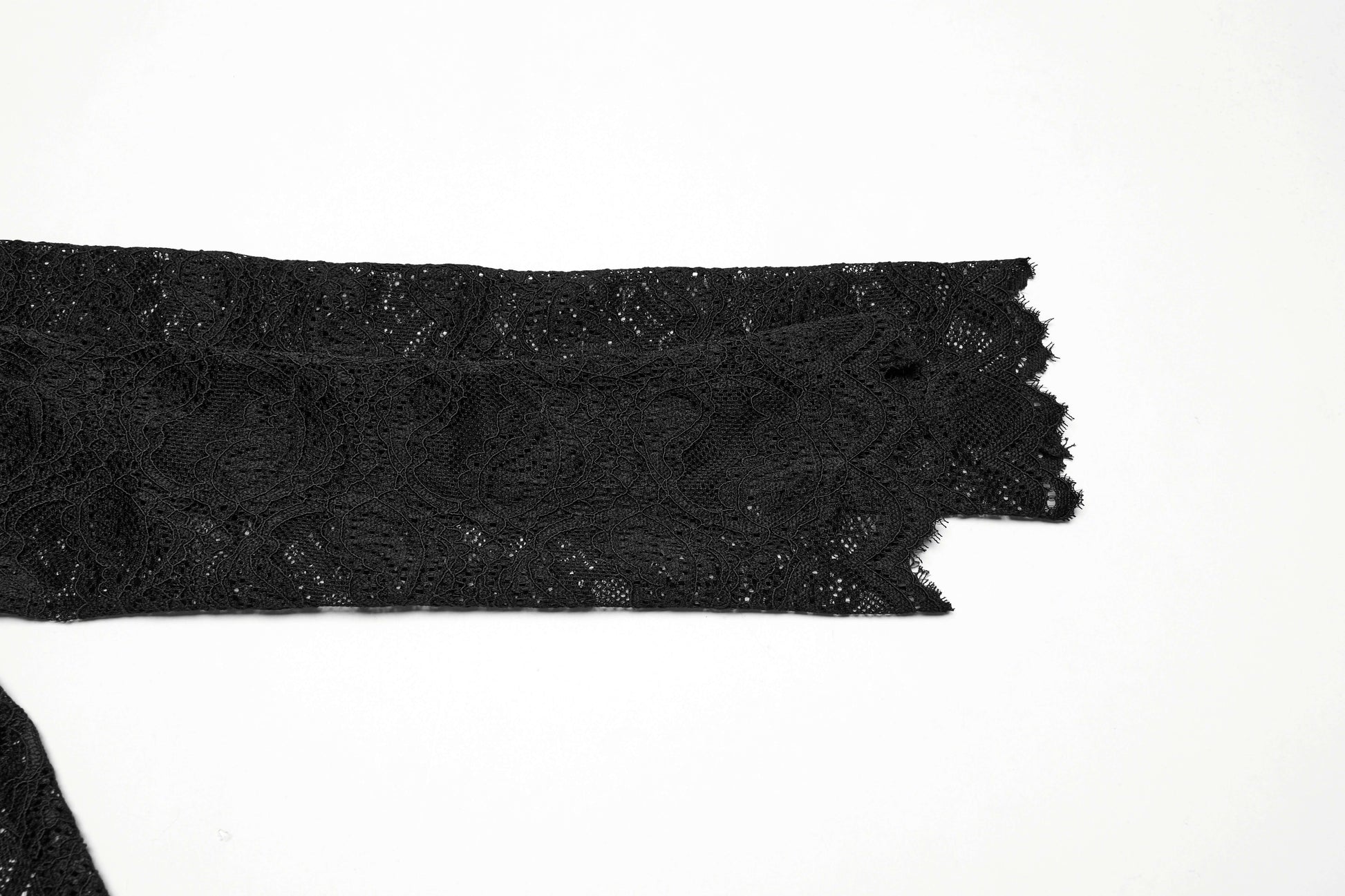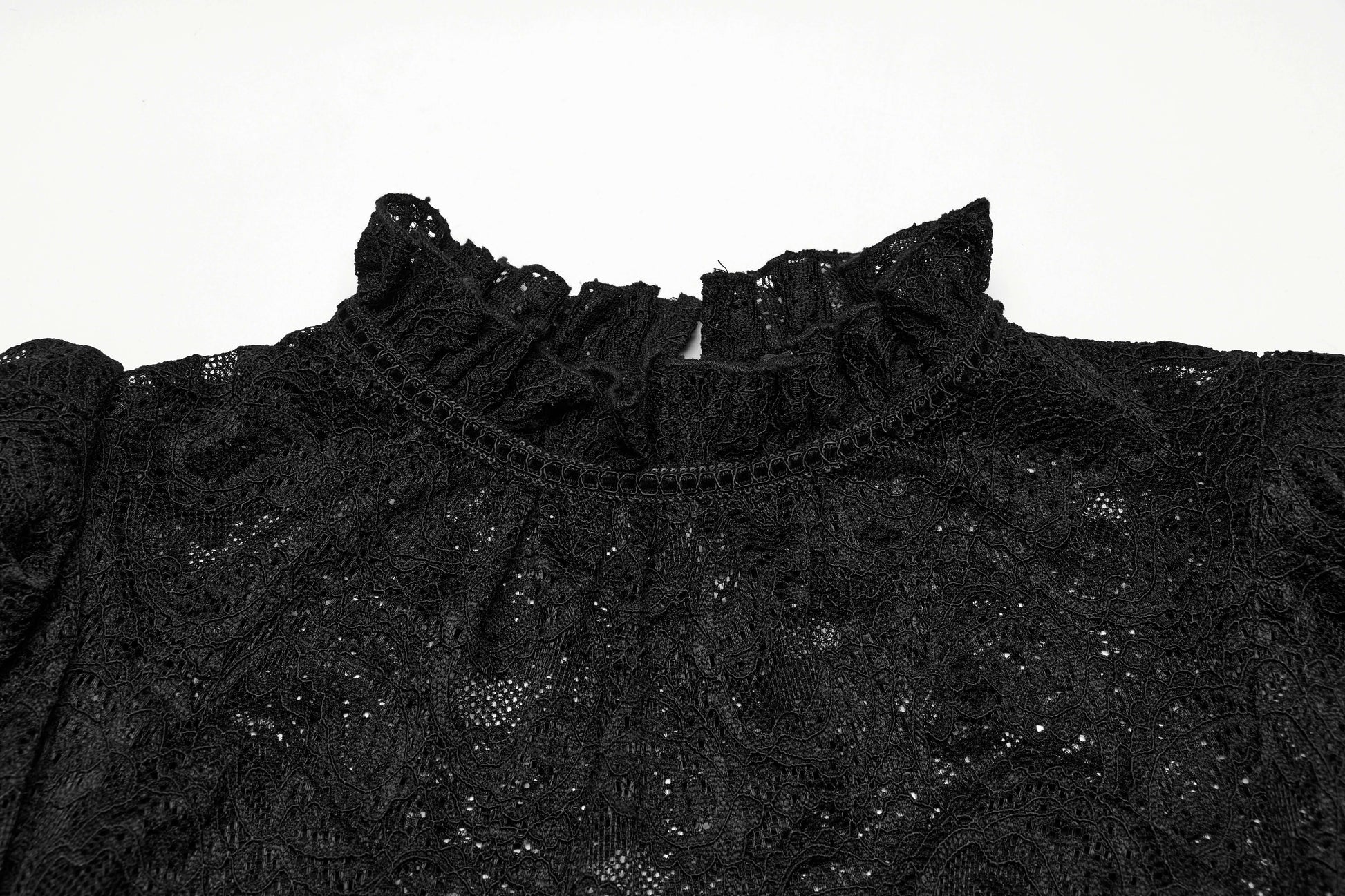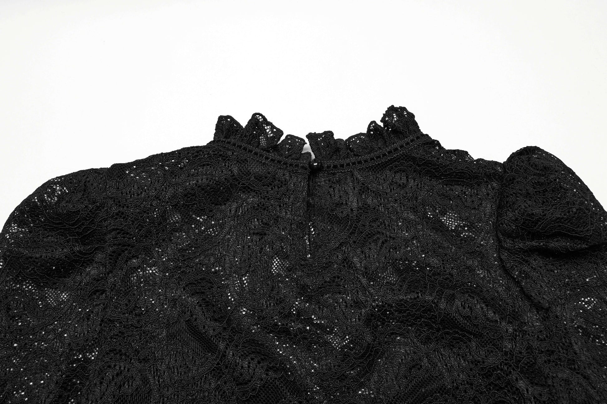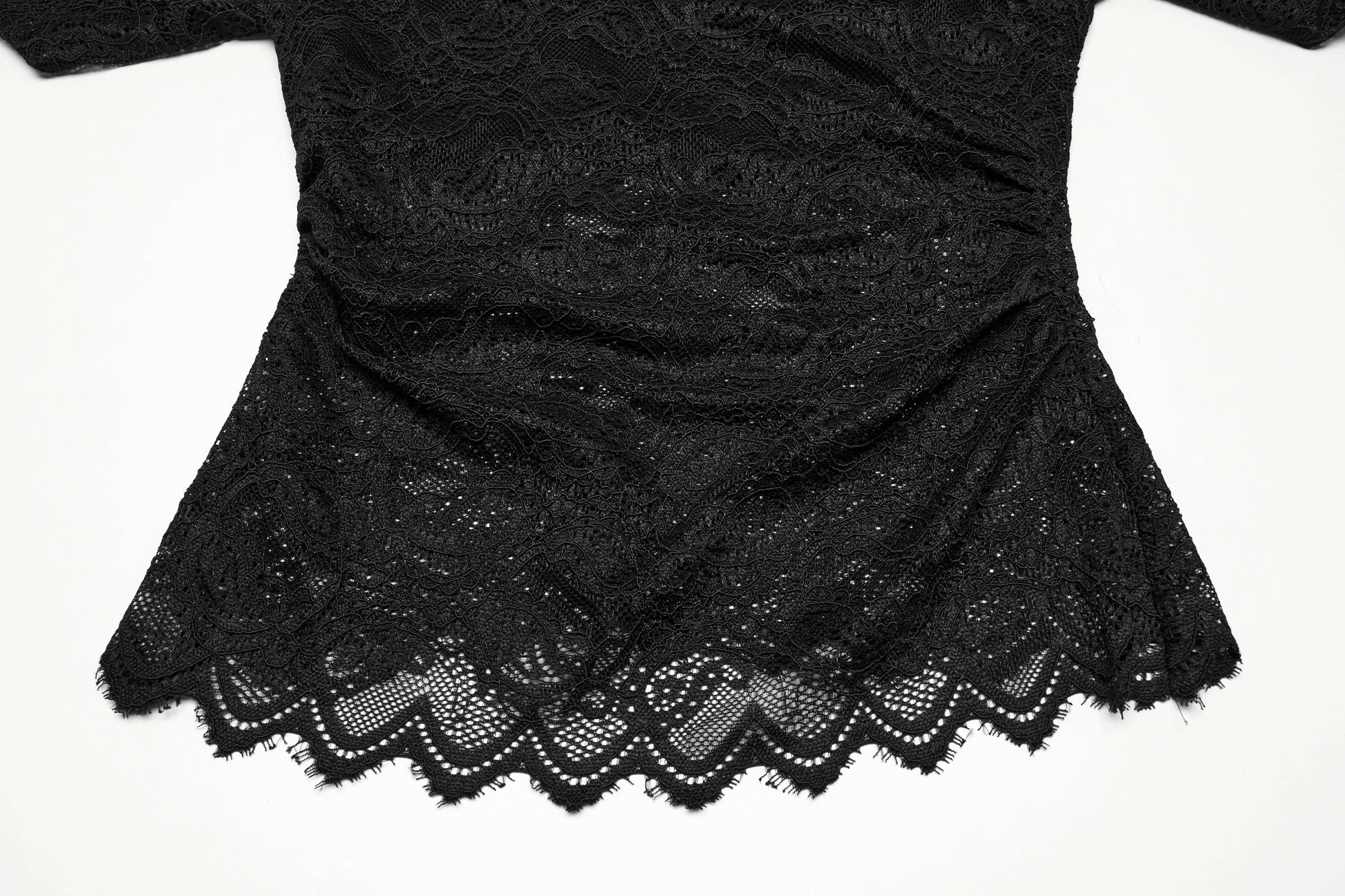 Rock the perfect balance of comfort and style with the Punk Rave Calantha Lace T-shirt! Made with soft lace and modal fabric, this tee features an elegant ruffled stand collar and bubble sleeves. The pleated waist enhances your shape, while the wavy edges add a touch of edginess. Available in two colors, with a convenient neck split design for easy dressing. Who says you can't be comfortable and fierce?
